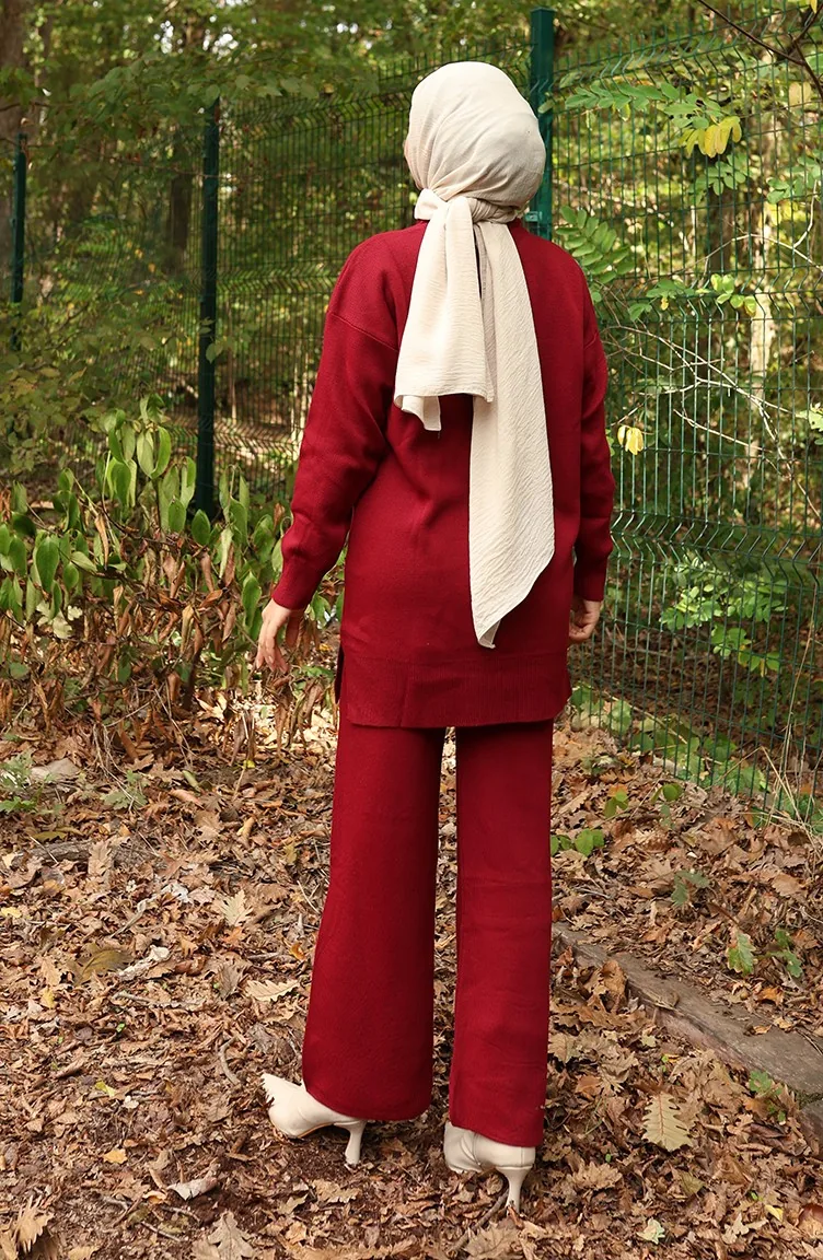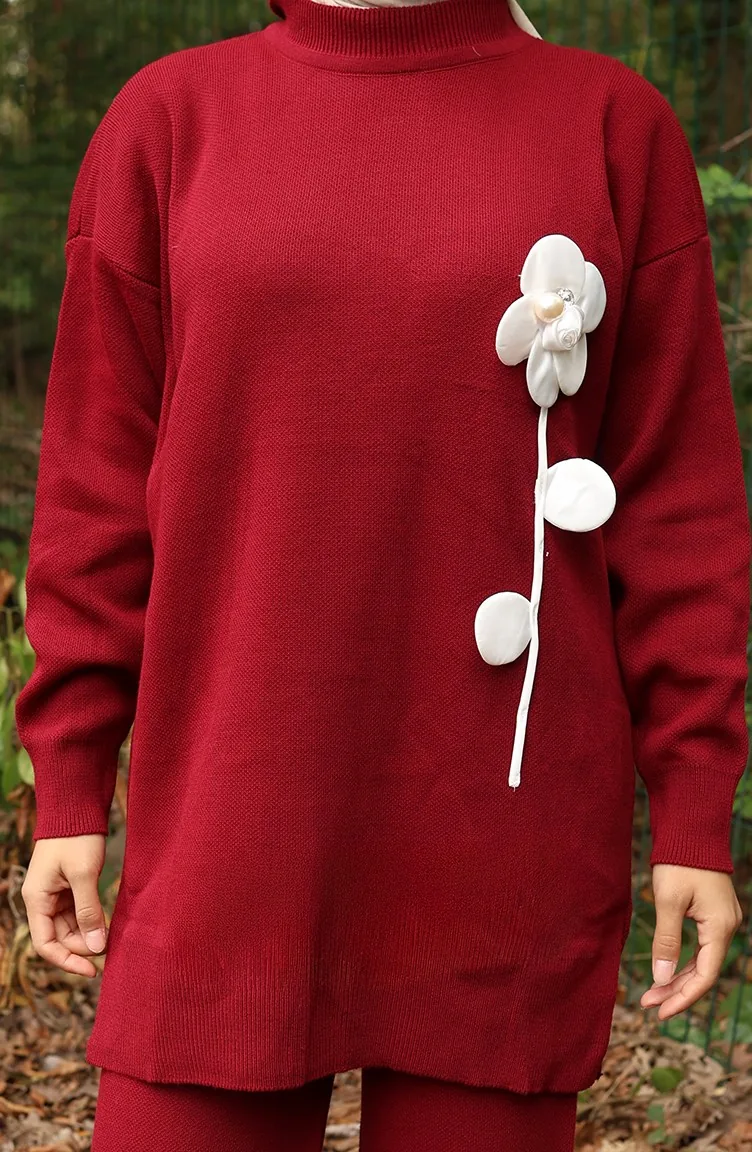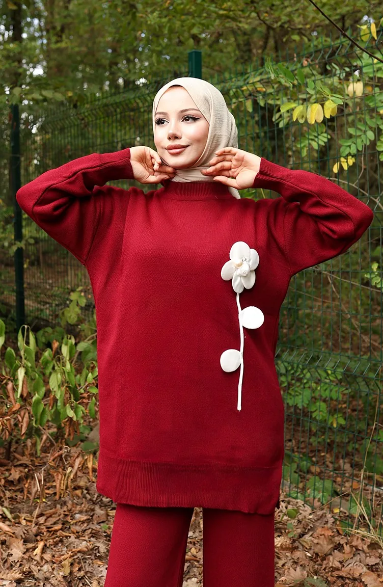 Knitwear Floral Figured Tunic Trousers Two Piece Suit 1017-06 Claret Red 1017-06