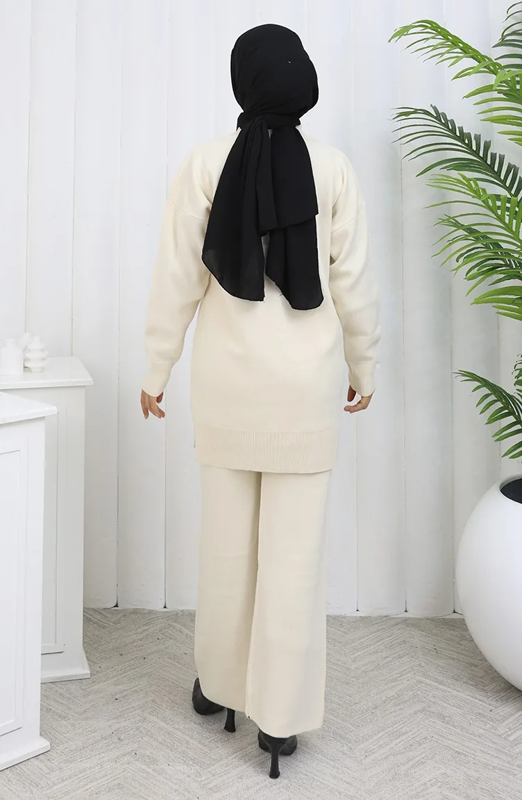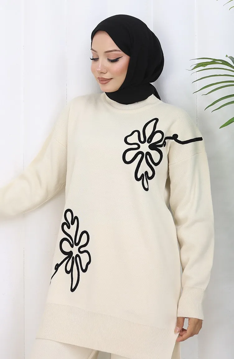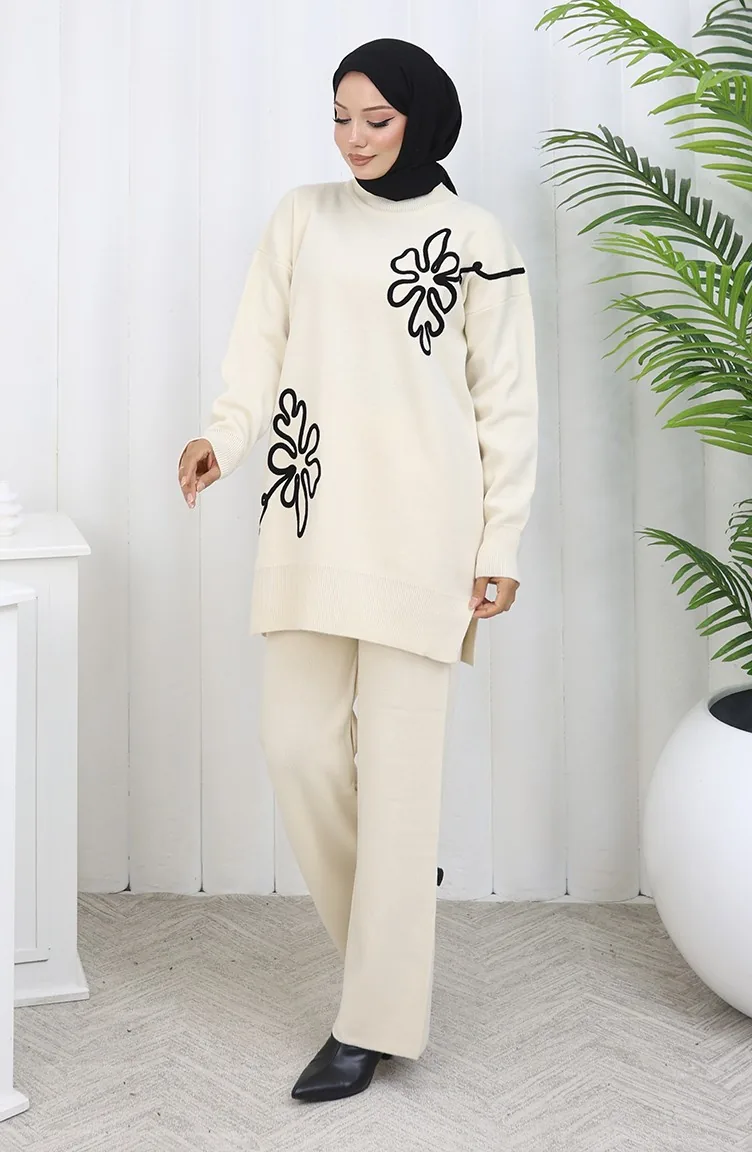 Knitwear Floral Patterned Tunic Trousers Two Piece Set 1110-08 Beige 1110-08