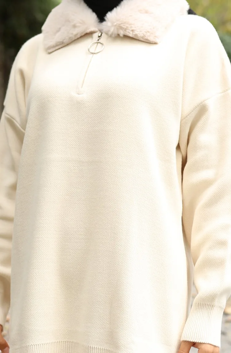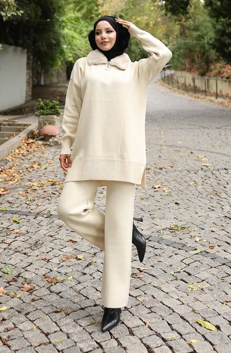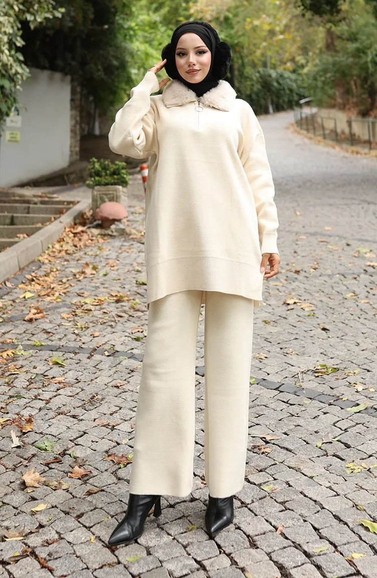 Knitwear Fur Collar Tunic Trousers Two Piece Suit 1059-01 Beige 1059-01