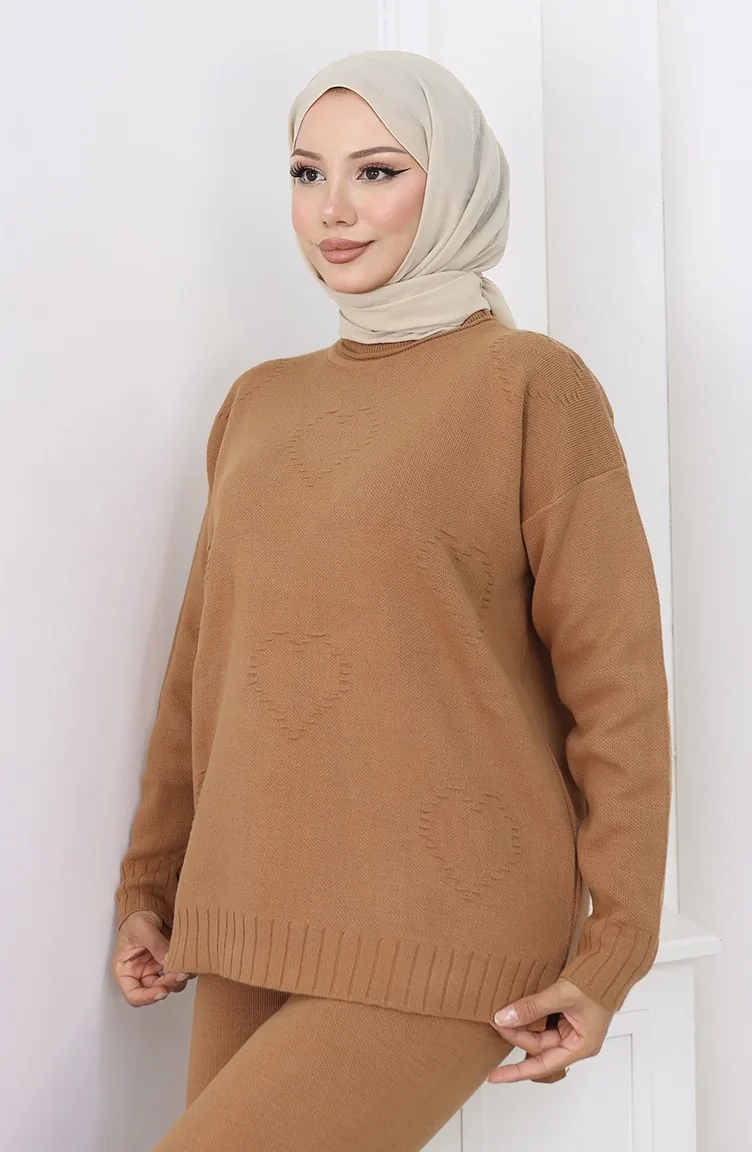 Knitwear Heart Patterned Sweater Trousers Two Piece Set 0016-03 Milk Coffee 0016-03