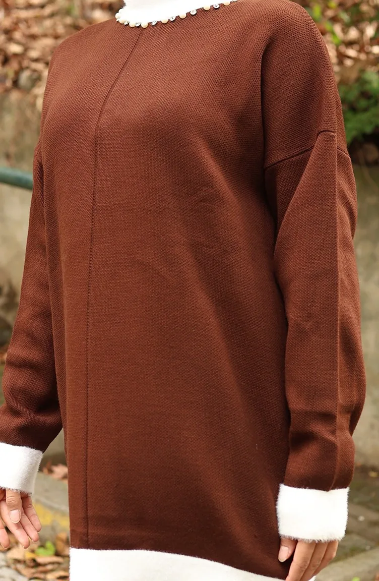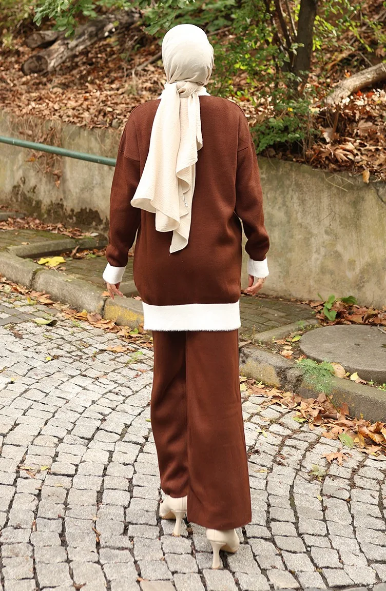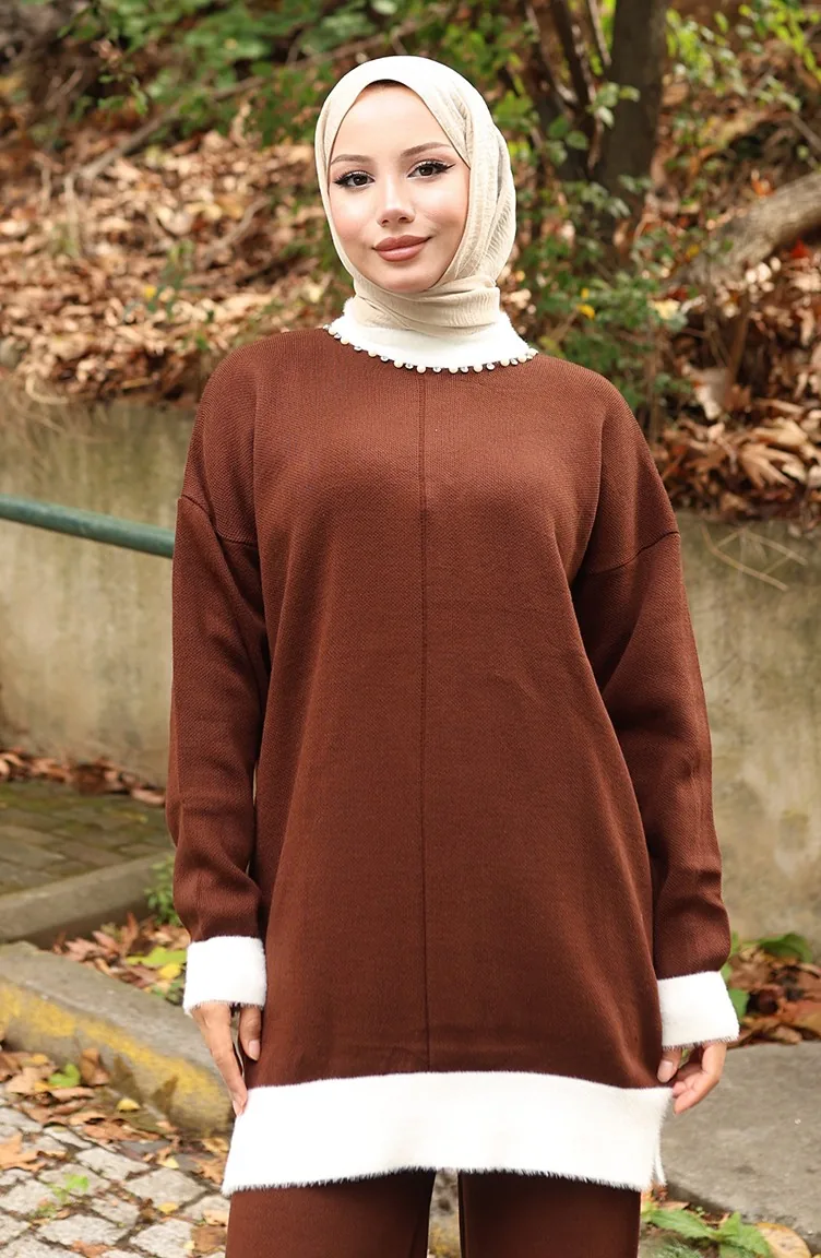 Knitwear Pearl Detailed Tunic Trousers Two Piece Suit 1011-07 Brown 1011-07