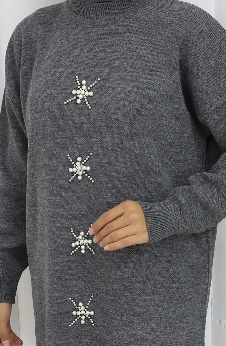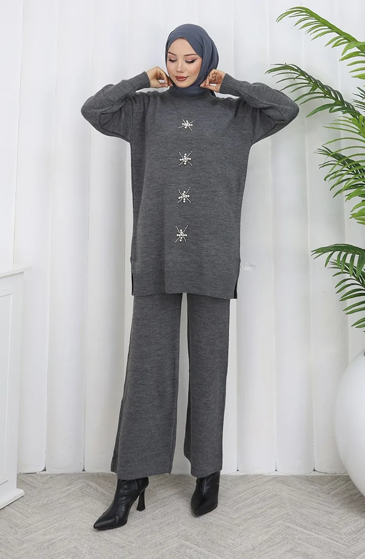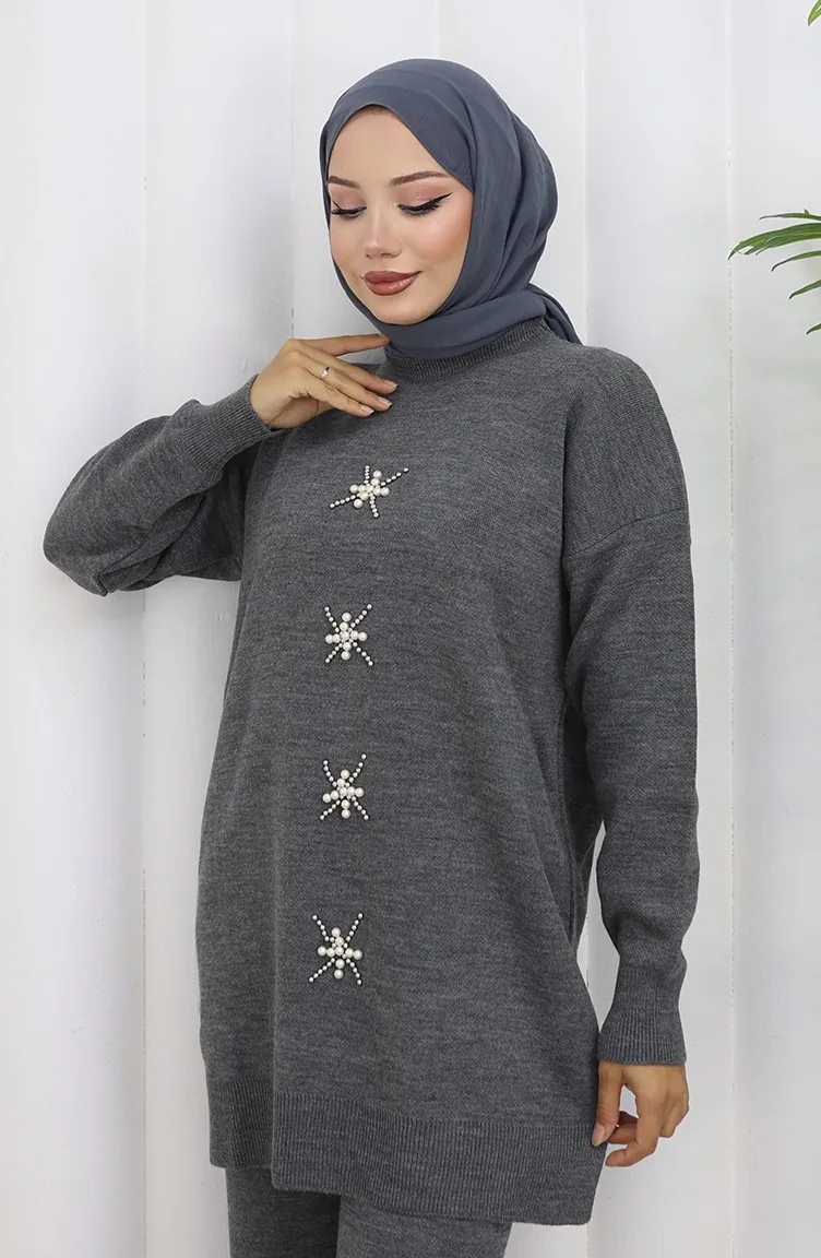 Knitwear Pearl Embroidered Tunic Trousers Two Piece Suit 1068-04 Gray 1068-04