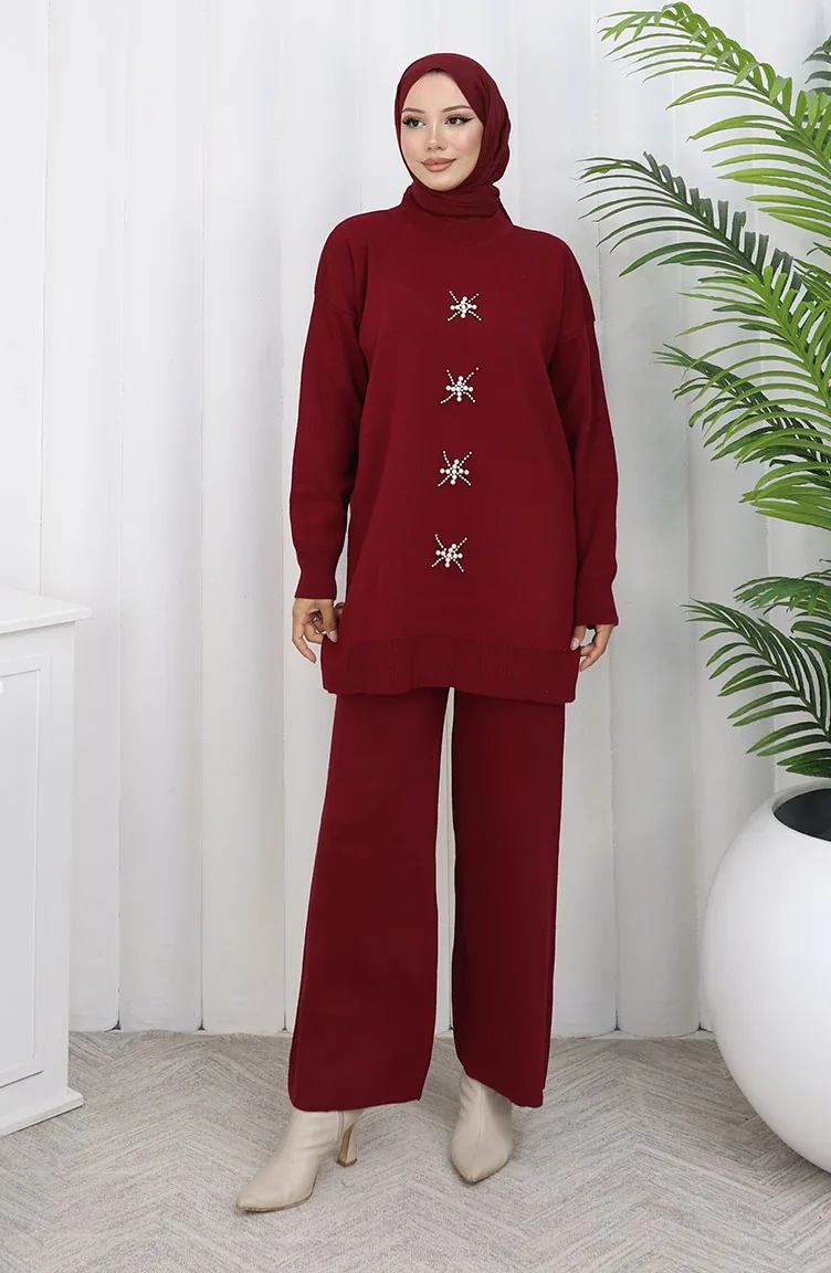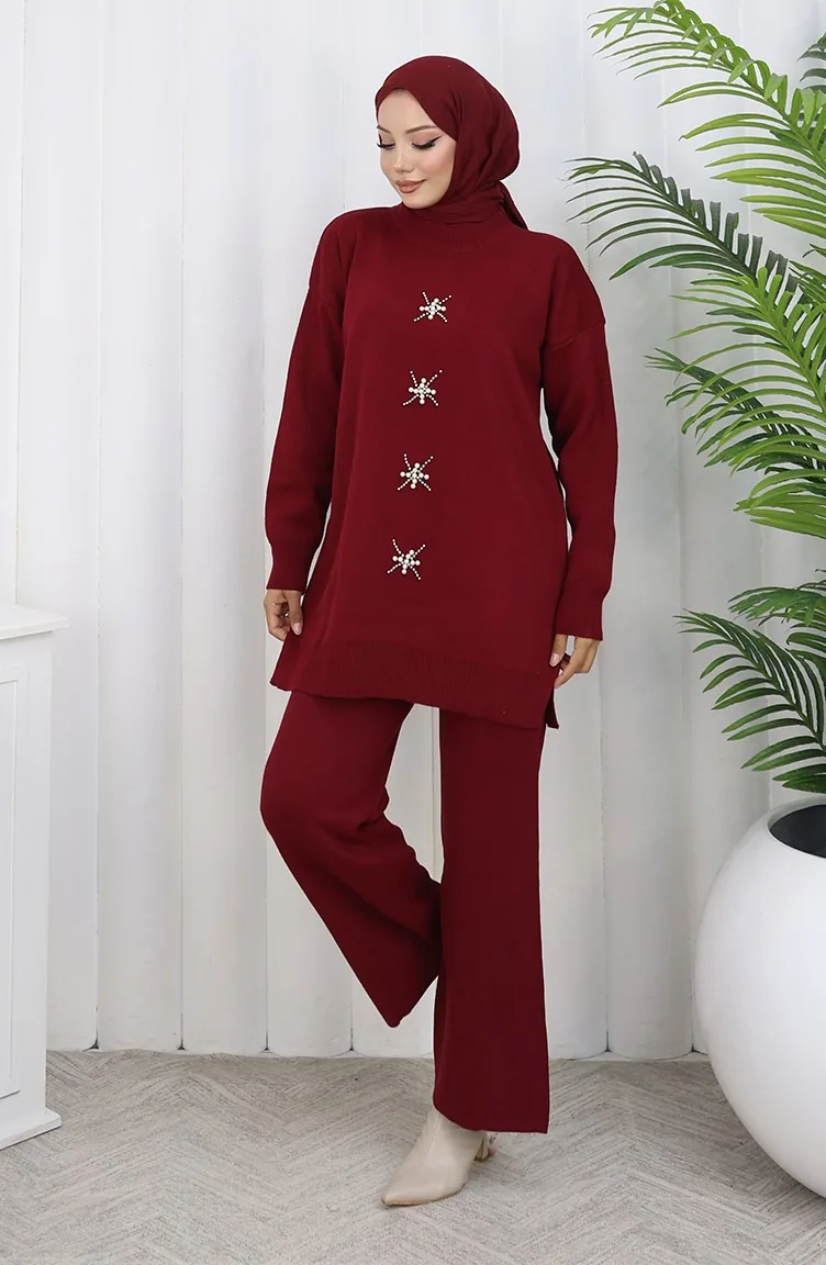 Knitwear Pearl Embroidered Tunic Trousers Two Piece Suit 1068-08 Claret Red 1068-08