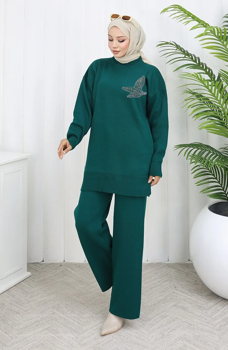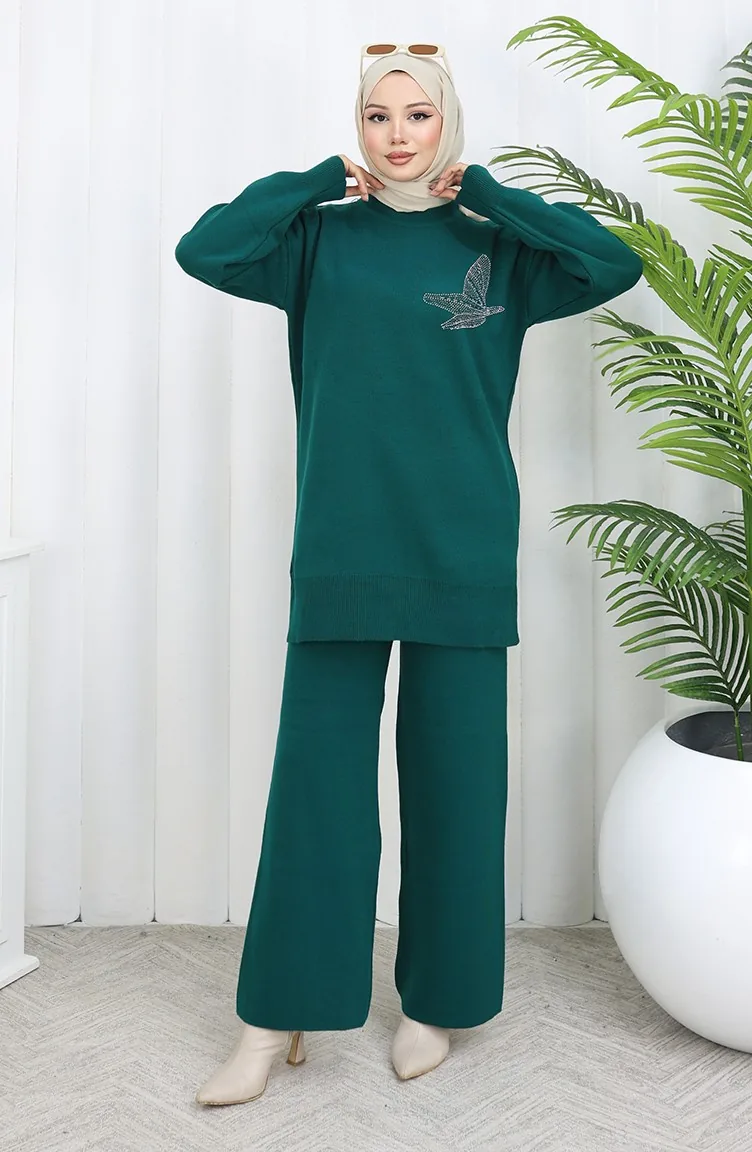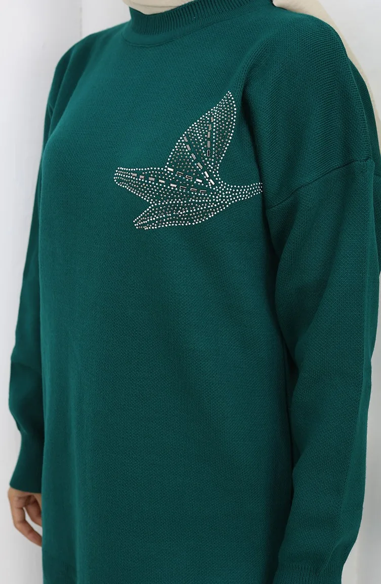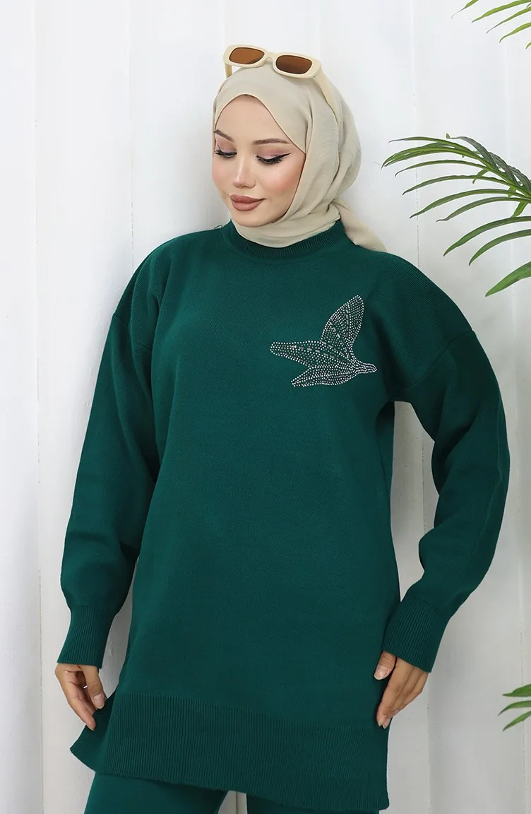 Knitwear Stone Printed Tunic Trousers Two Piece Set 1053-04 Petrol 1053-04