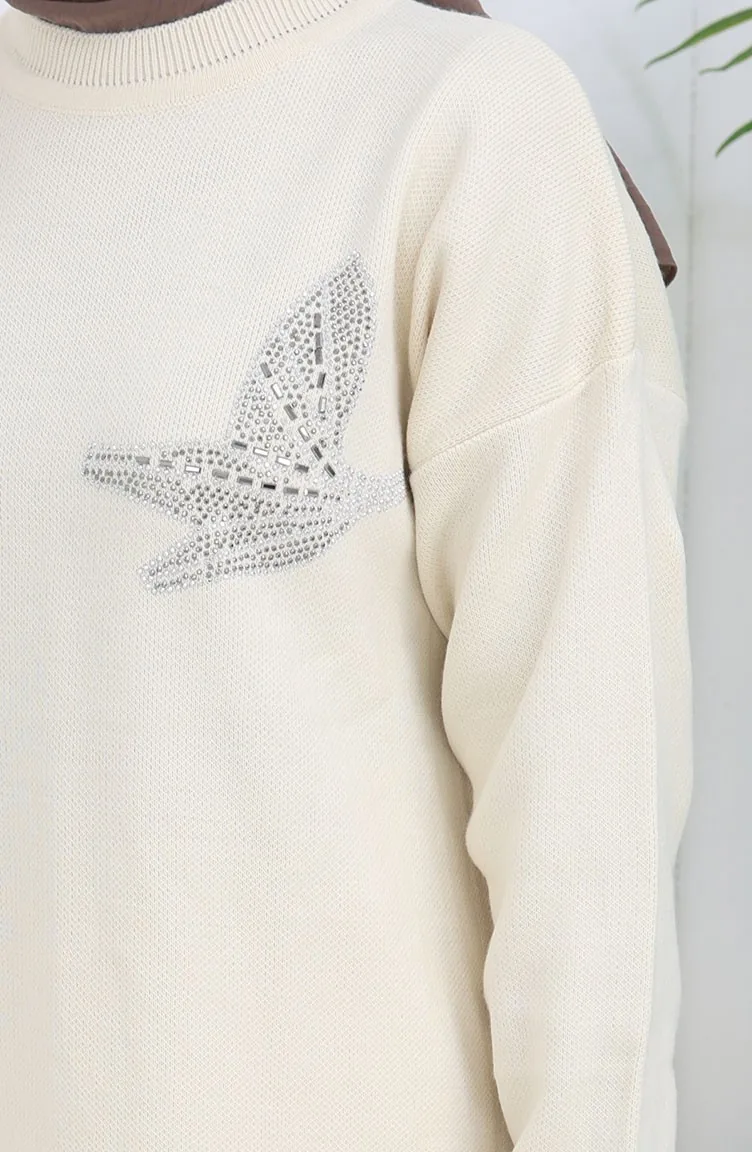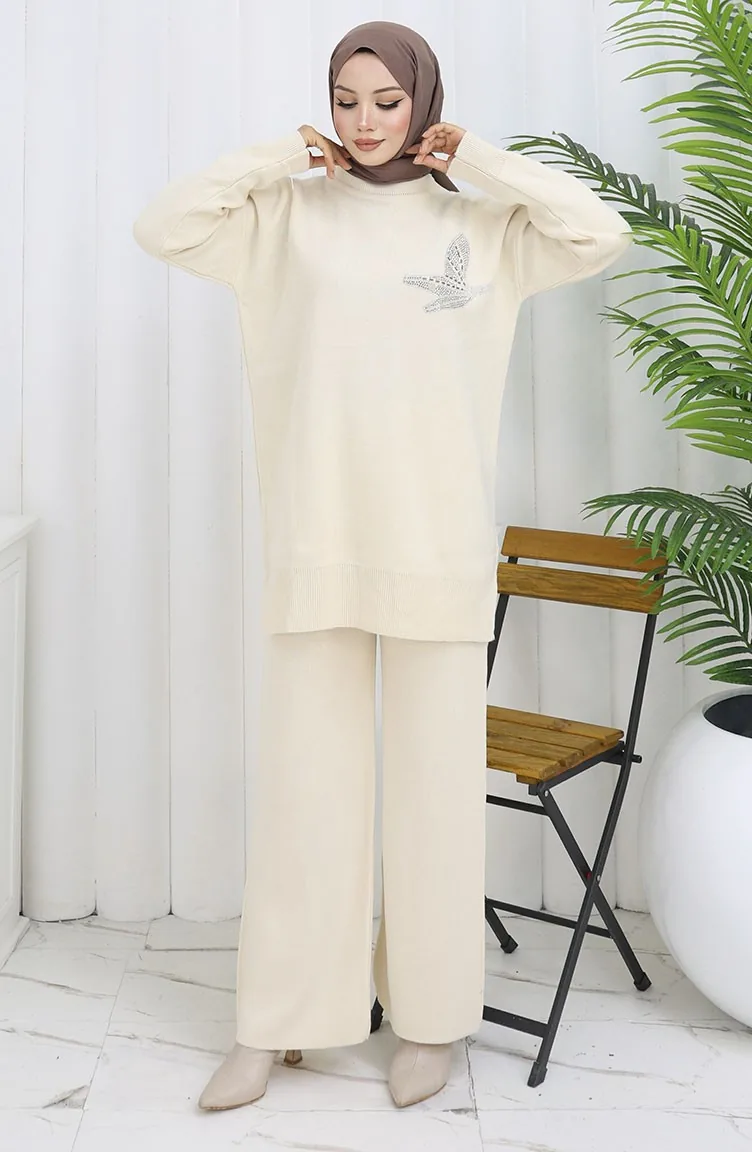 Knitwear Stone Printed Tunic Trousers Two Piece Set 1053-08 Beige 1053-08