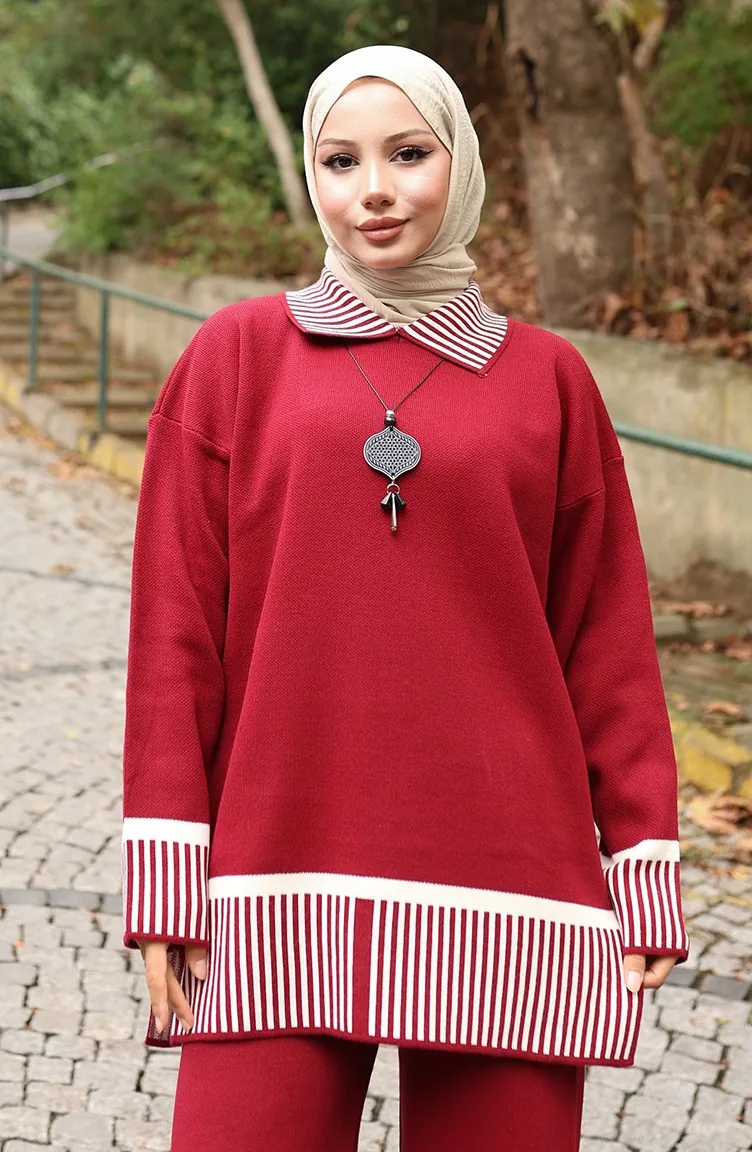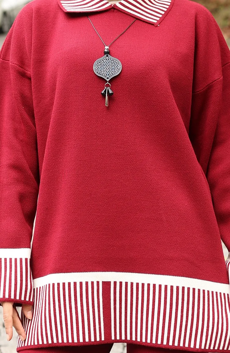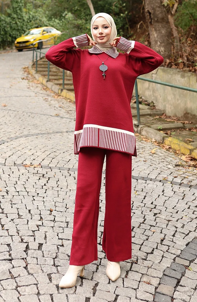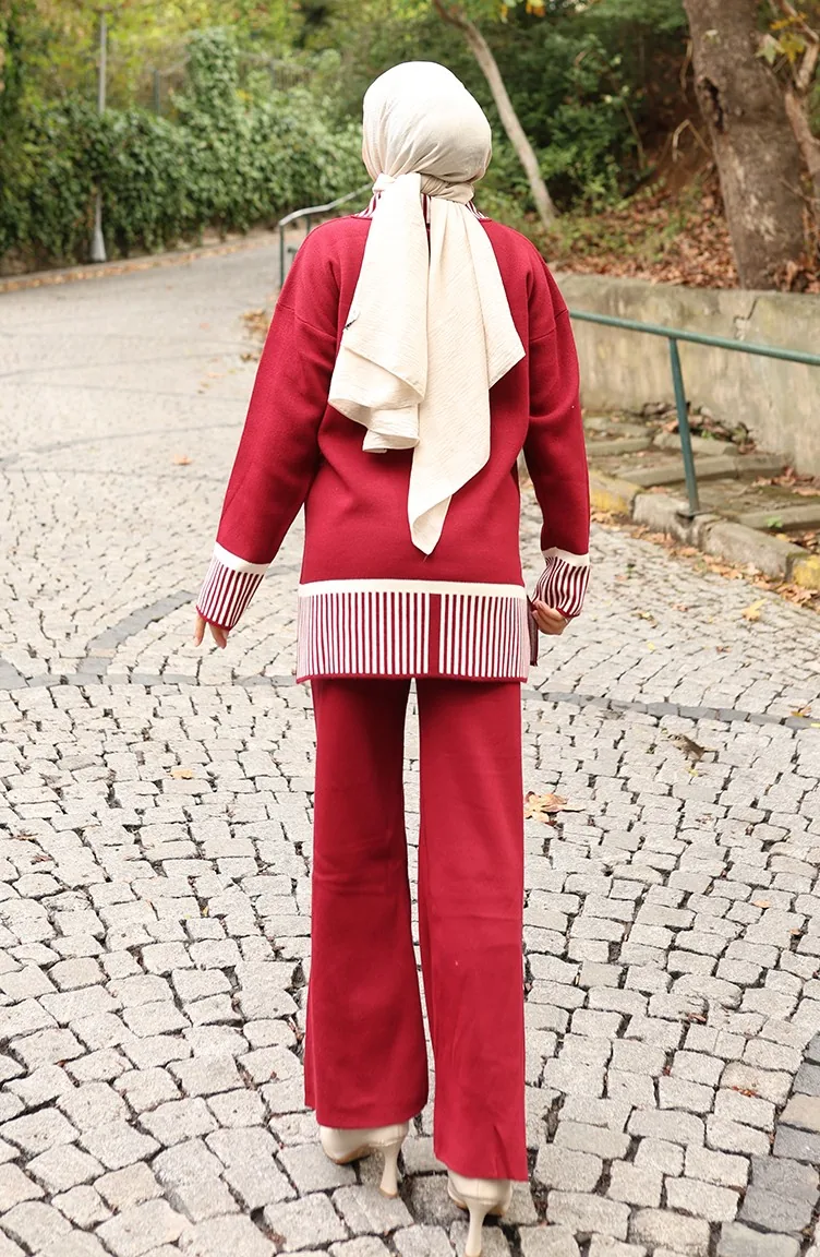 Knitwear Stripe Detailed Tunic Trousers Two Piece Suit 1066-04 Claret Red 1066-04