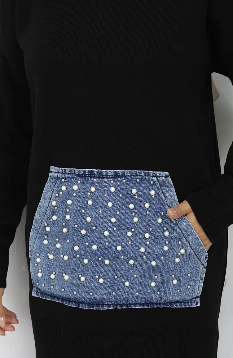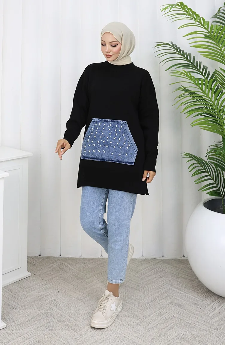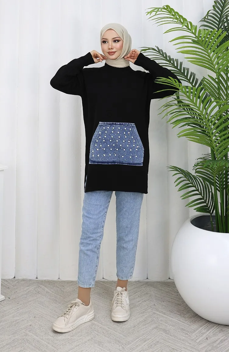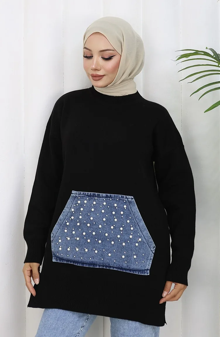 Knitwear Kangaroo Pocket Pearl Detailed Tunic 3030-02 Black 3030-02