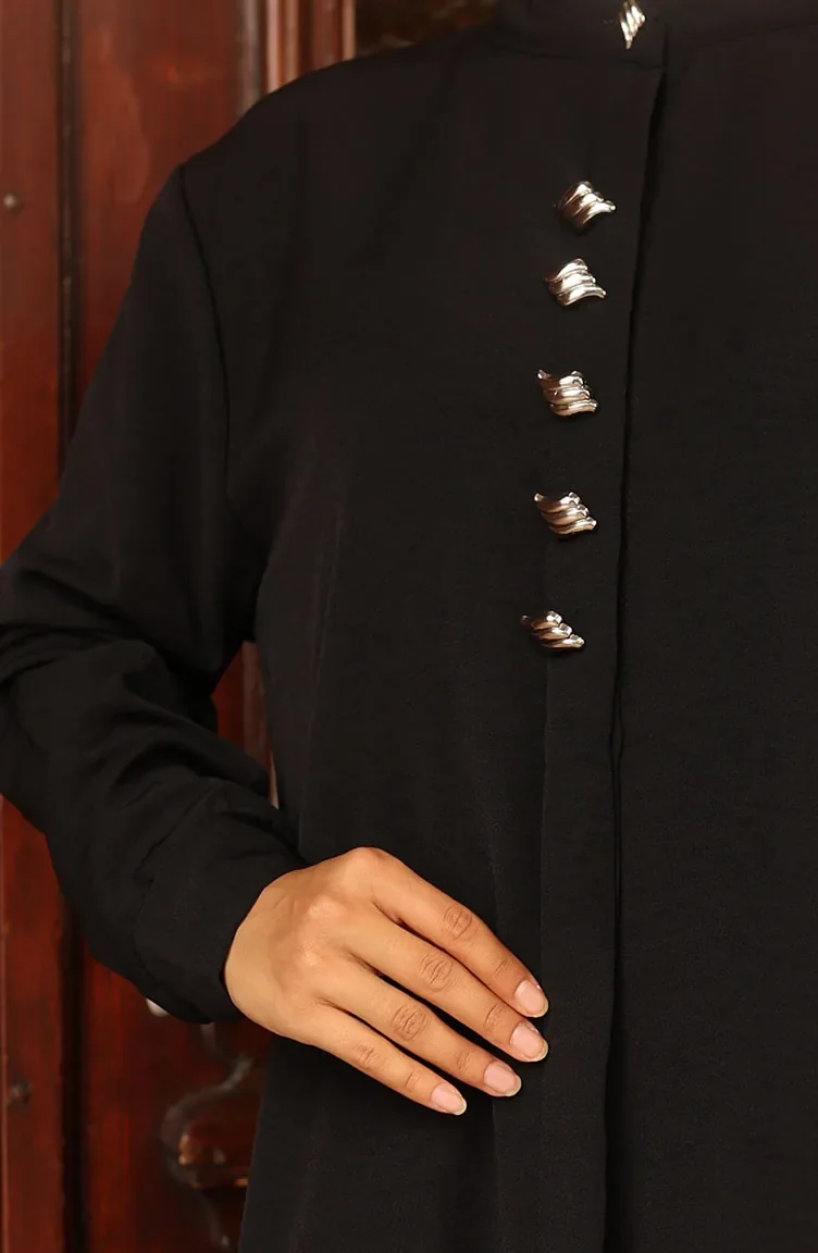 Black color is used. Aerobin. It has a plain appearance. Buttons have been used to make it easy to use. Tippet collar is prefered. Suitable for 4 seasons. Plus size option available.