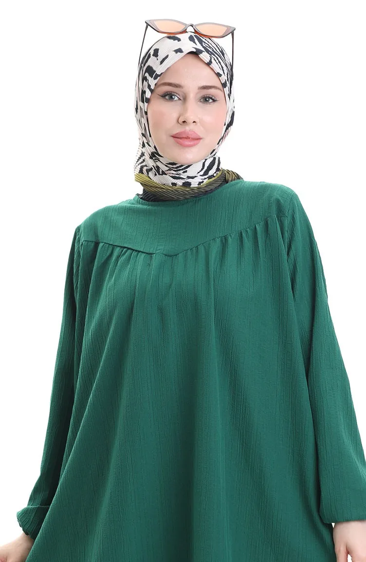 Emerald green color used. The cotton fabric has an absorbent texture. It has a plain appearance. When the tunic combined with another product, you will get a nice suit. It's made of elastic sleeves. The Zero collar is preferred for all types of clothing. Suitable for 4 seasons. The size worn by the model, is the one on the image.