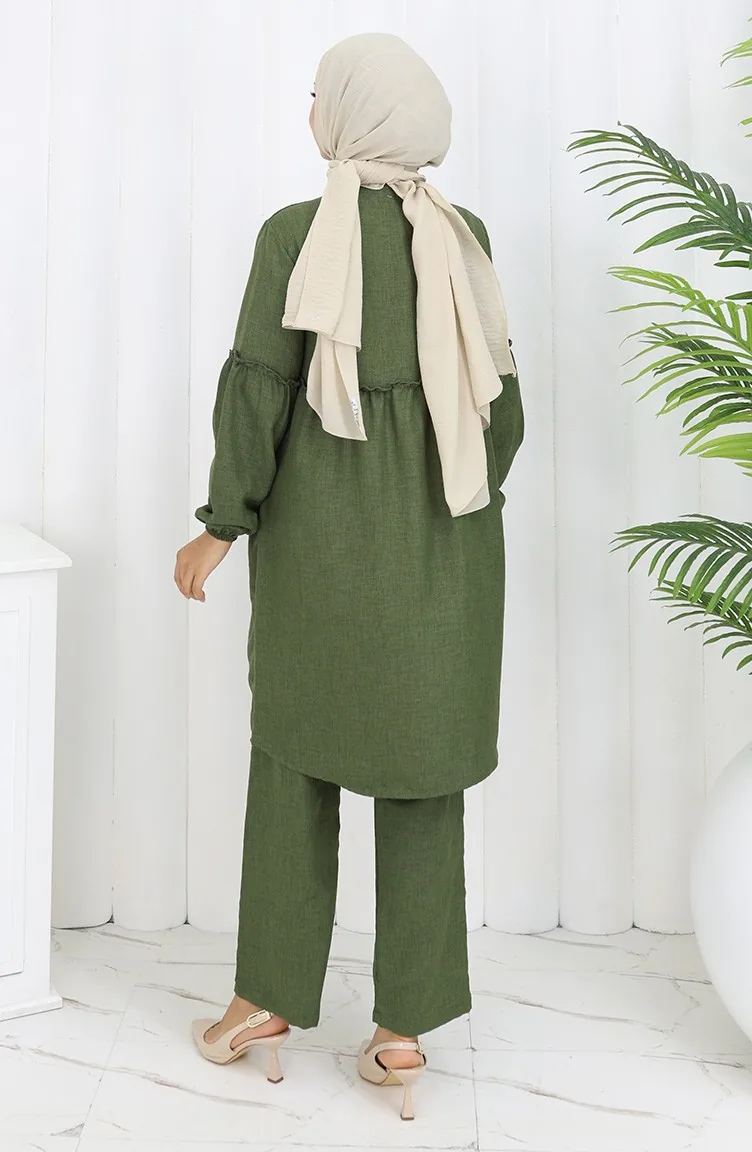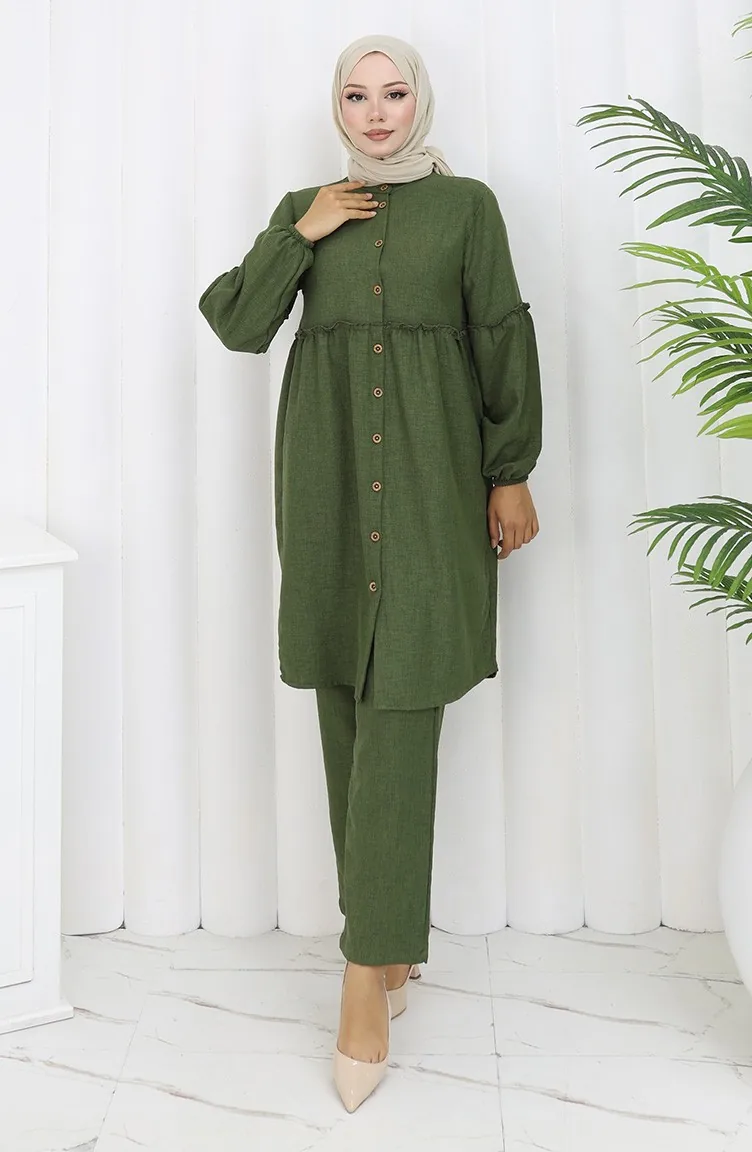 Gathered Buttoned Tunic Trousers Two Piece Suit 0115-01 Khaki 0115-01