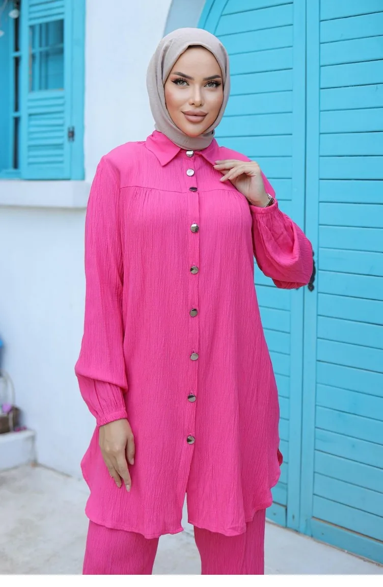 Fuchsia color is used. Polyester fabric often prevents wrinkling. It has a plain appearance. Suitable for 4 seasons. Plus size option available.