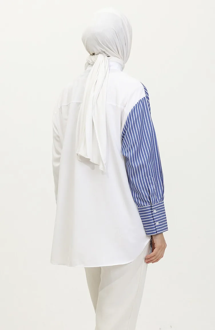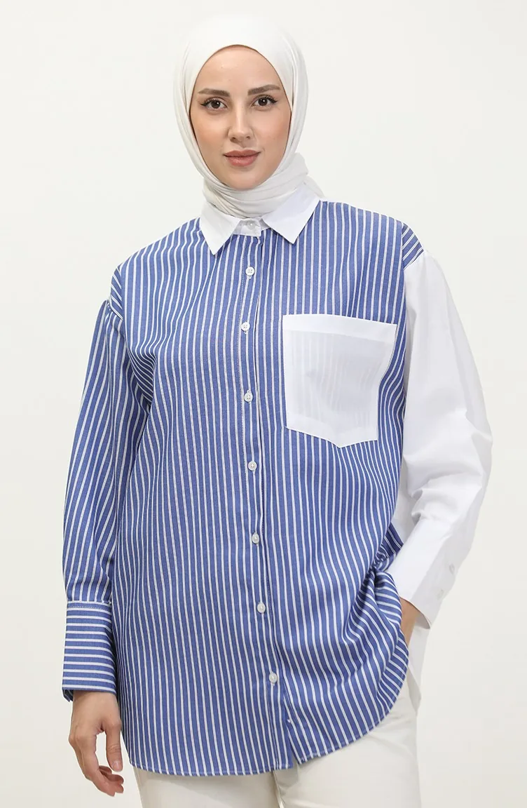 Saxon blue color is used. The cotton fabric has an absorbent texture. Designed with a striped fabric. The product is used unlined. Long sleeve product. Suitable for 4 seasons. Plus size option available.