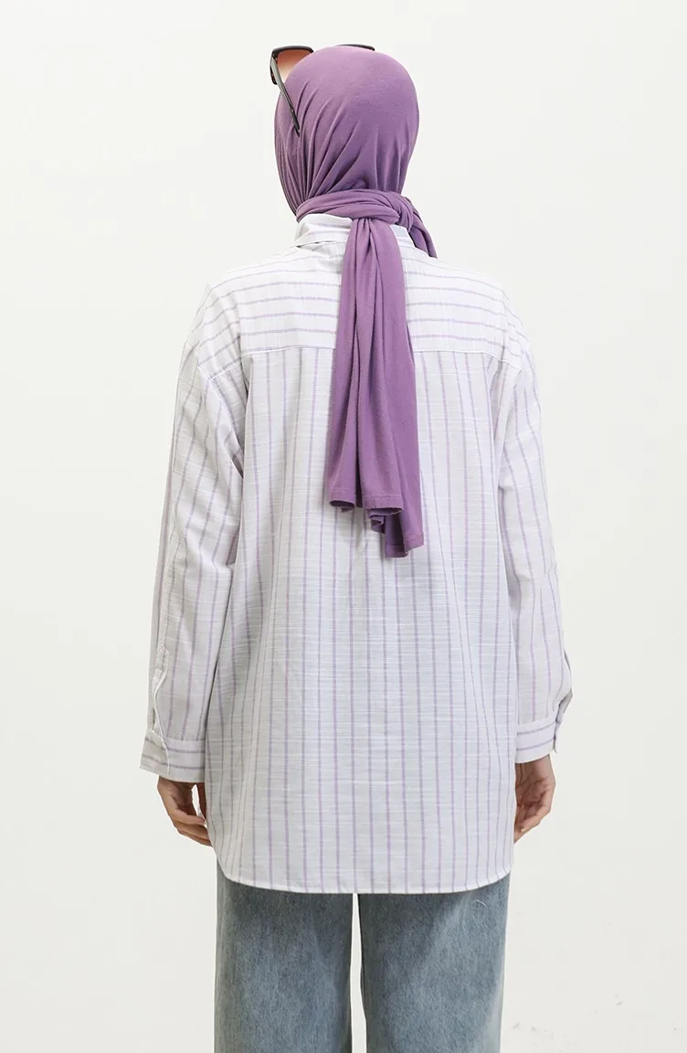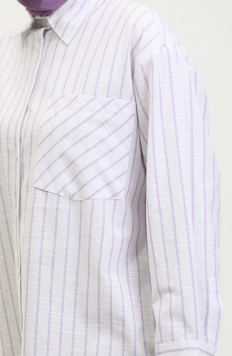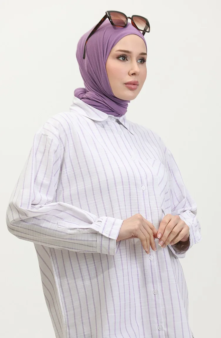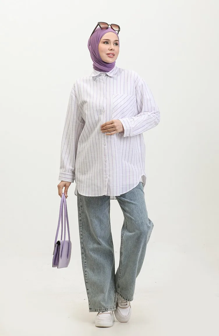 Lilac color is used. The cotton fabric has an absorbent texture. Designed with a striped fabric. The product is used unlined. Long sleeve product. Suitable for 4 seasons. Plus size option available.