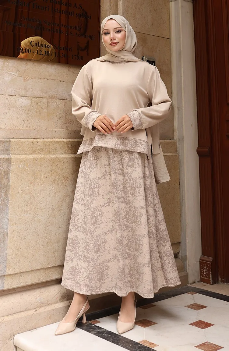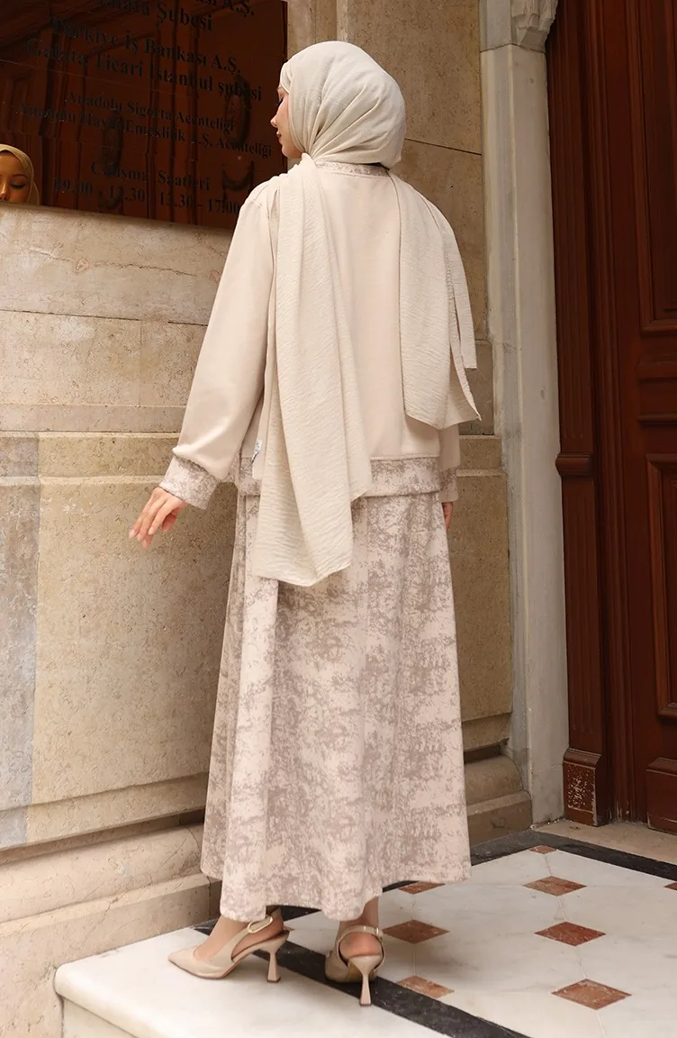 Oysho Fabric Patterned Skirted Hijab Suit 0218-02 Beige 0218-02