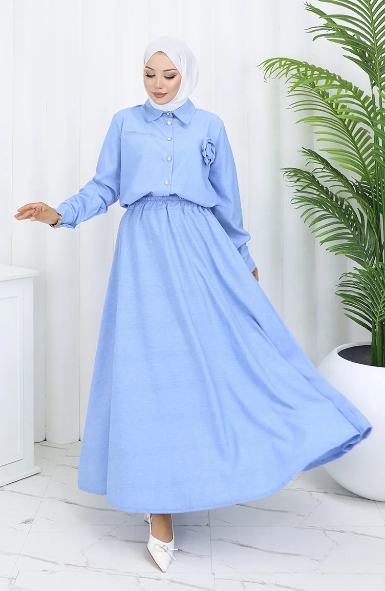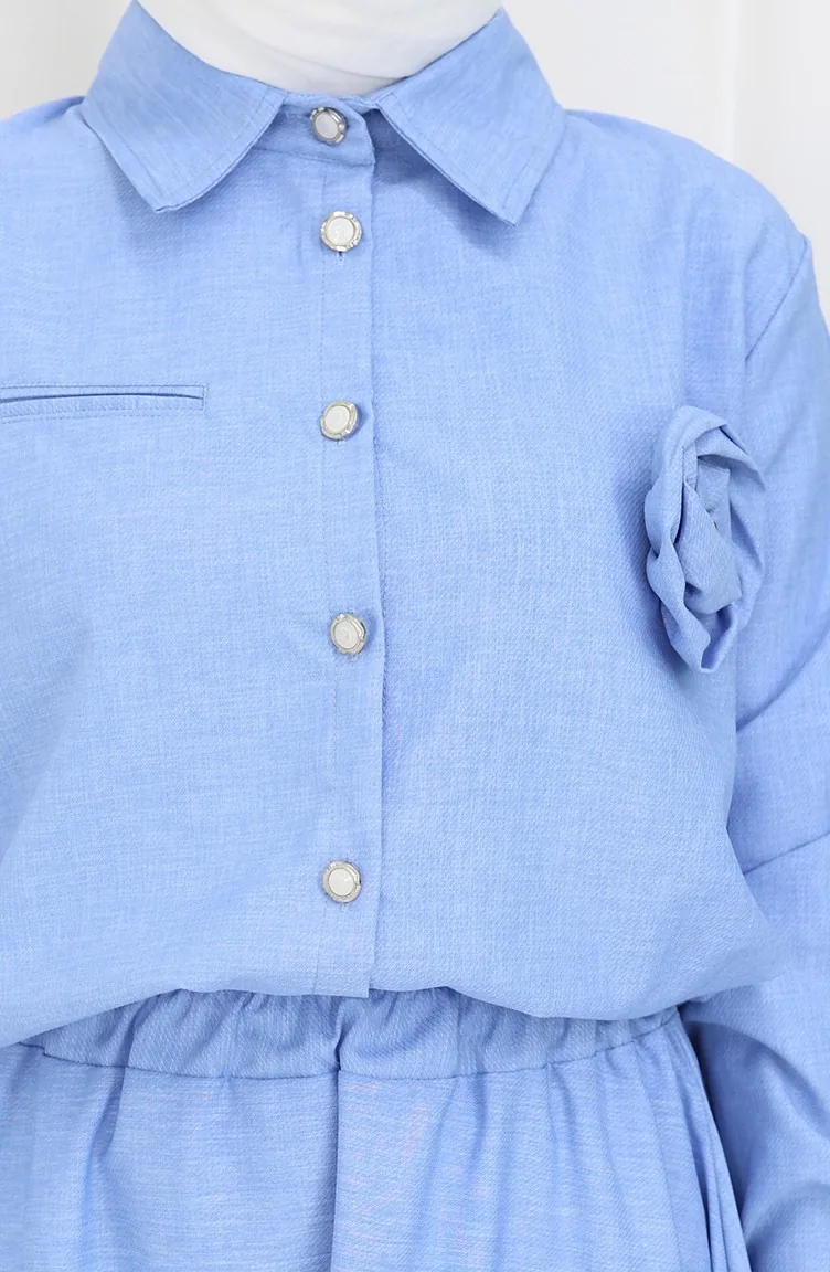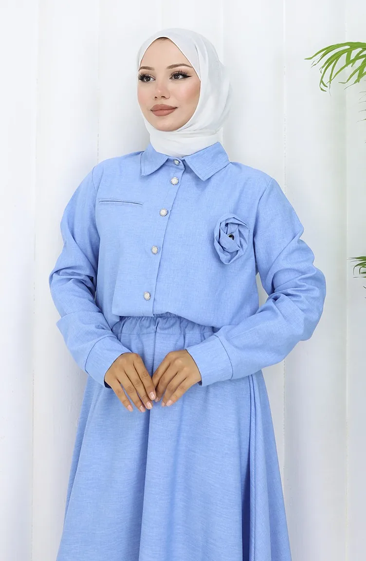 Rose Detailed Shirt Skirt Two Piece Suit 2088-01 Ice Blue 2088-01