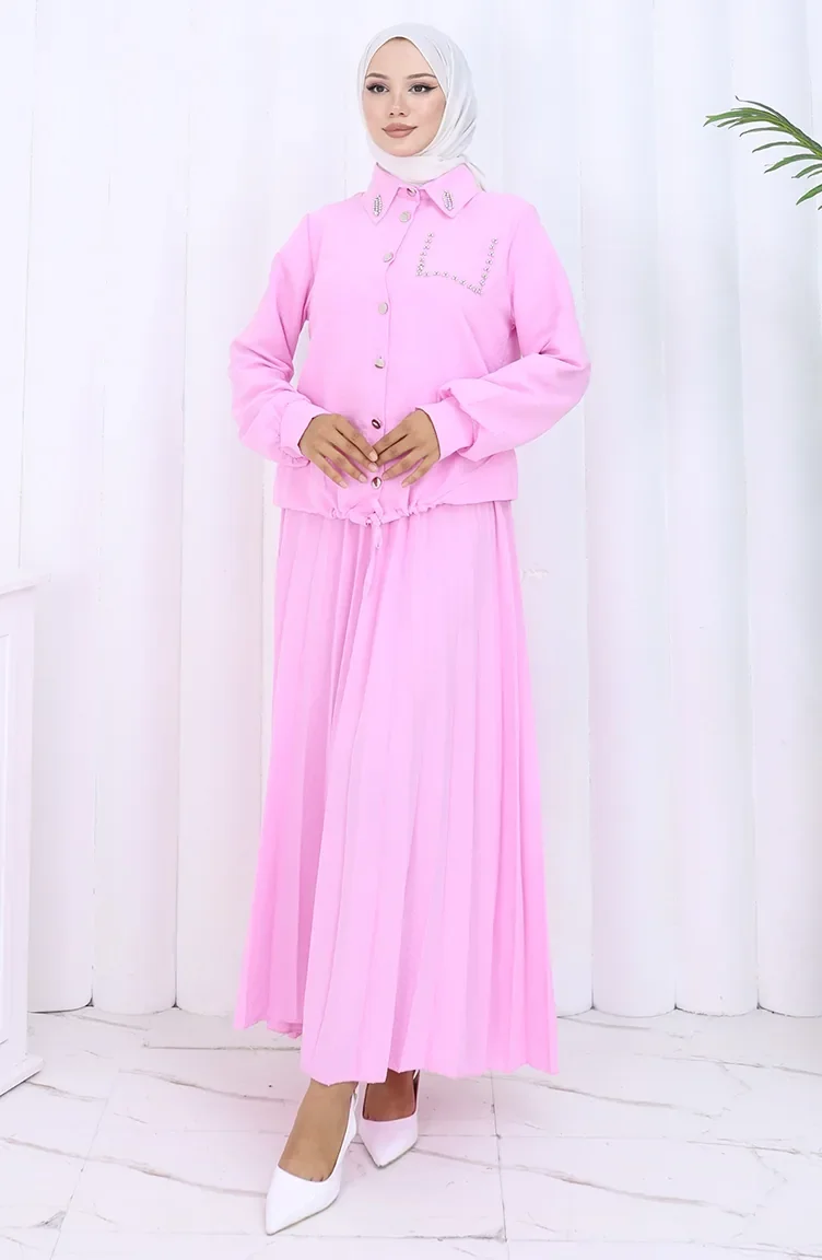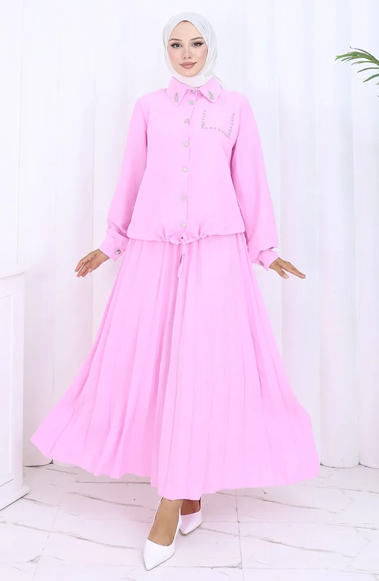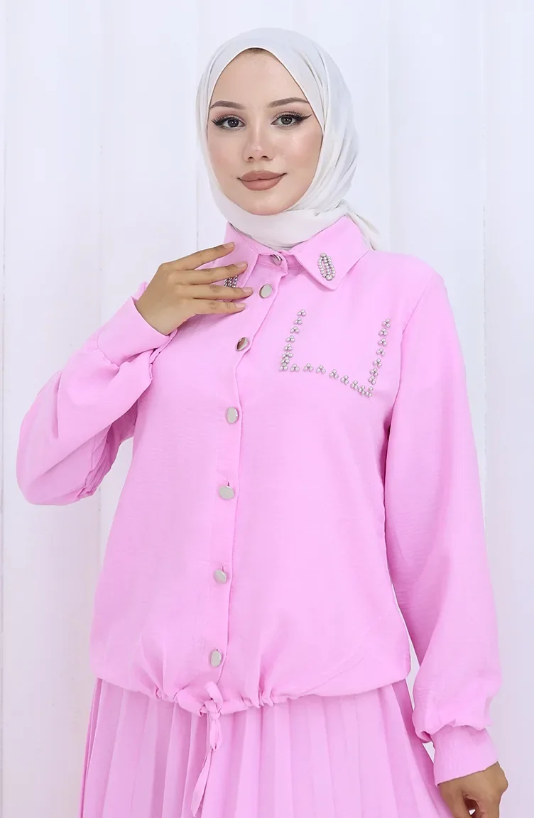 Stoned Buttoned Shirt Skirt Two Piece Suit 2113-07 Pink 2113-07