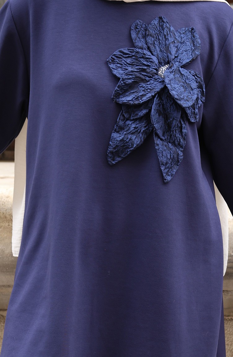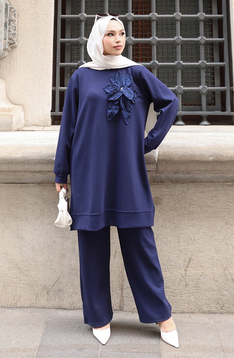 Oysho Fabric Flower Appliqued Hijab Two Piece Suit 0214-02 Navy Blue 0214-02