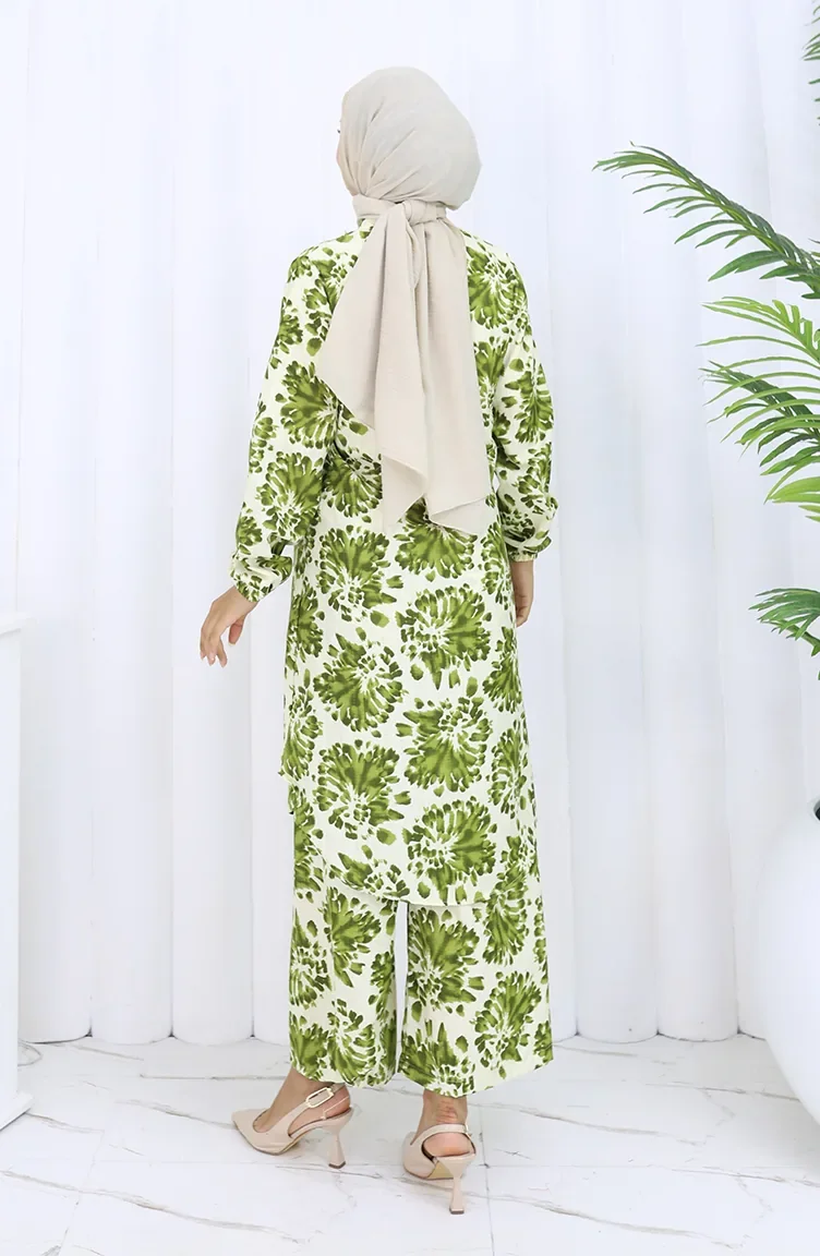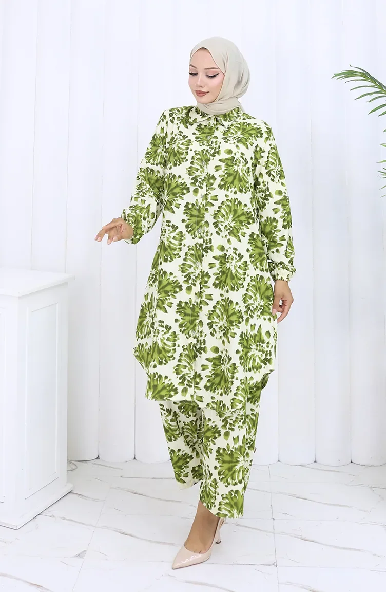 Patterned Tunic Trousers Two Piece Set 0126-02 Khaki 0126-02