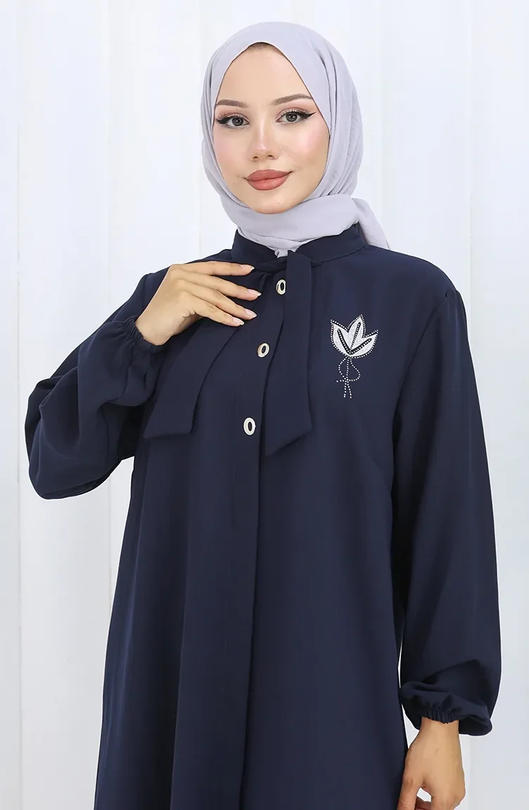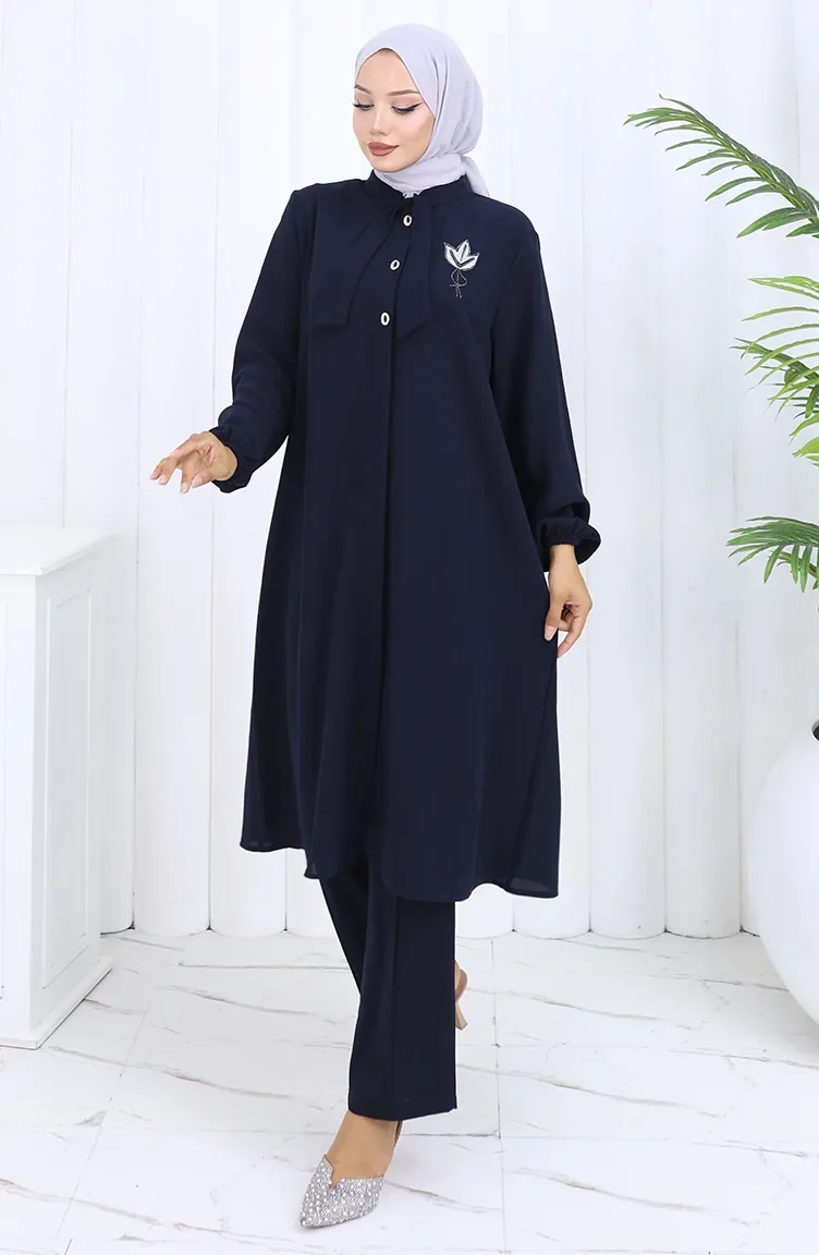 Plus Size Embroidered Tunic Trousers Two Piece Suit 6254-02 Navy Blue 6254-02
