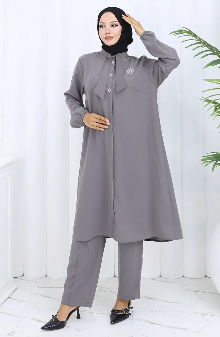 Plus Size Embroidered Tunic Trousers Two Piece Suit 6254-03 Gray 6254-03