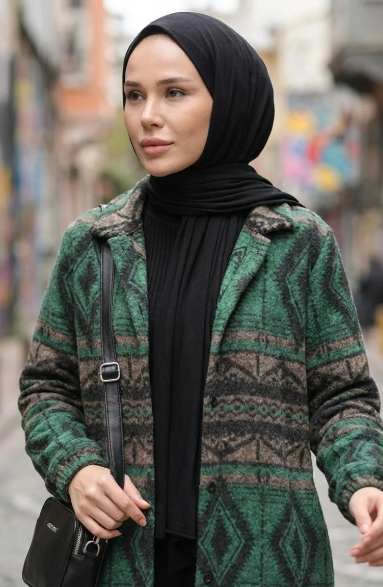 Ethnic Patterned Buttoned Winter Coat 2500-04 Emerald Green Mink 2500-04