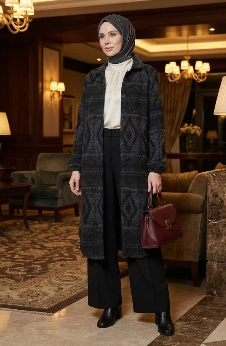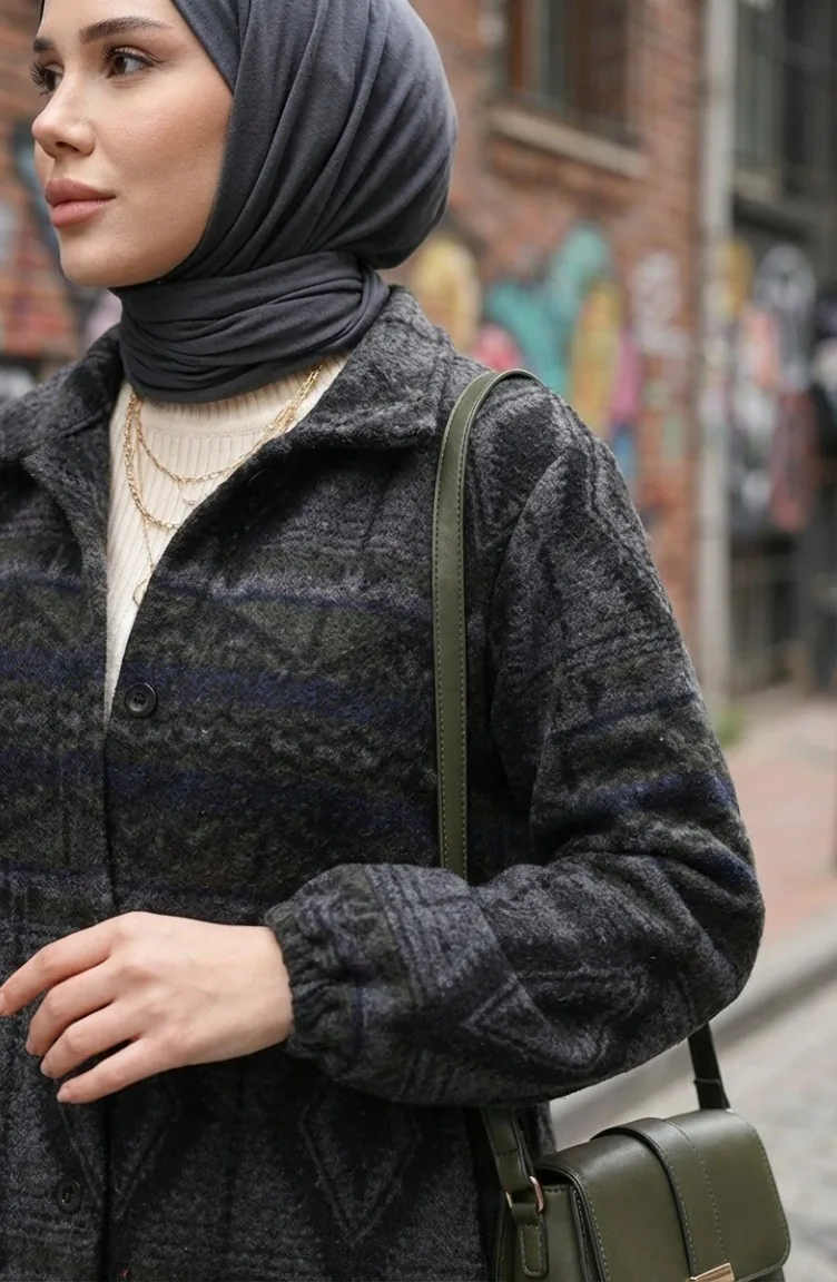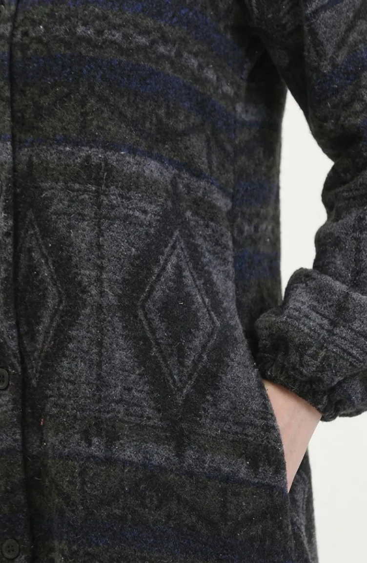 Ethnic Patterned Buttoned Winter Coat 2500-05 Khaki Anthracite 2500-05