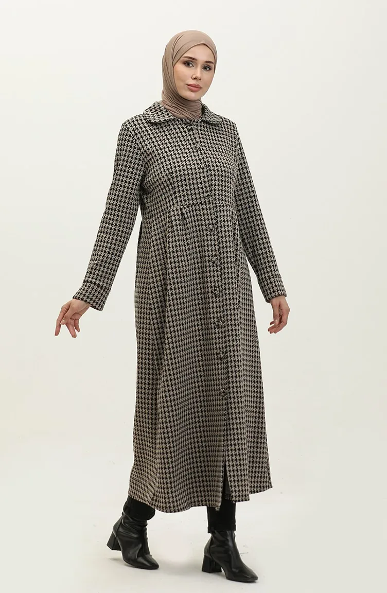 Elastane Fabric. It has a chic design that consists of goosefoot patterns. The product is used unlined. Long sleeve product. Baby collar is used. Designed from thick fabric. Plus size option available.