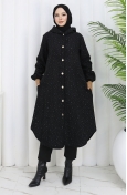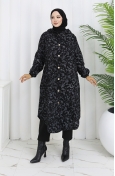Black color is used. It is cachet fabric, you can use it easily in winter. Designed with patterned fabric. It's made of elastic sleeves. Designed from thick fabric. The size worn by the model, is the one on the image.