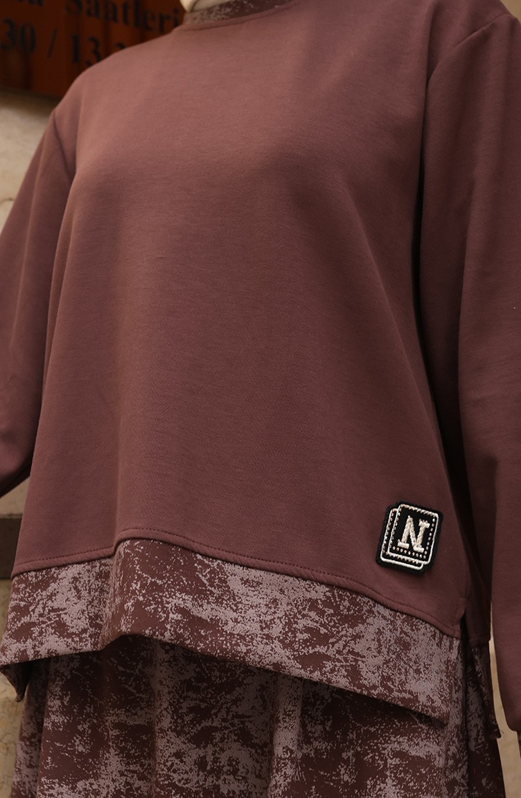 Oysho Kumaş Desenli Etekli Tesettür Takım 0218-03 Kahverengi