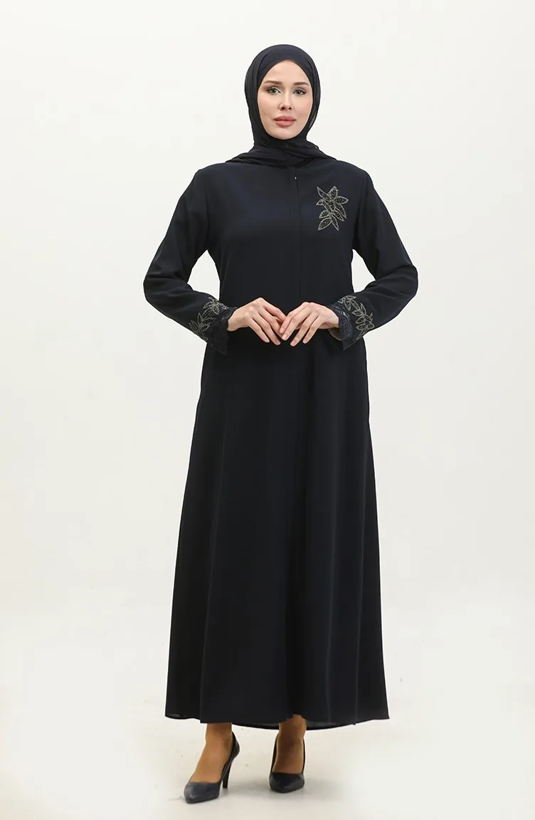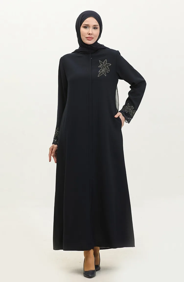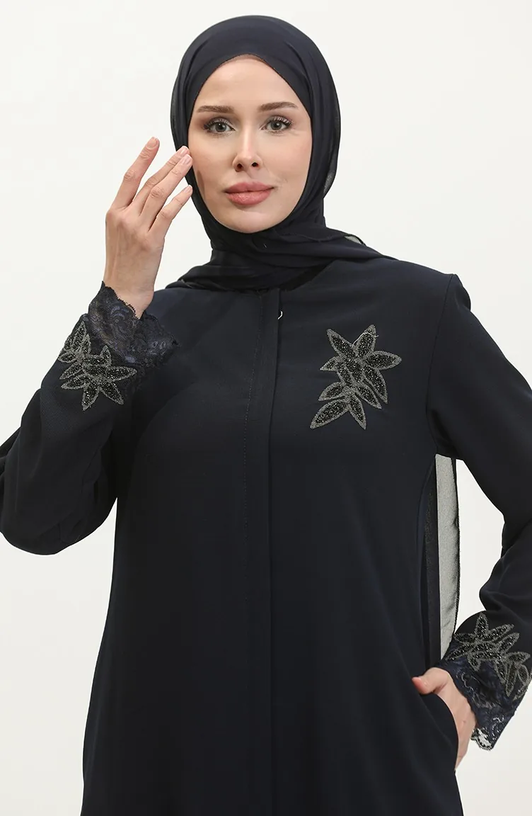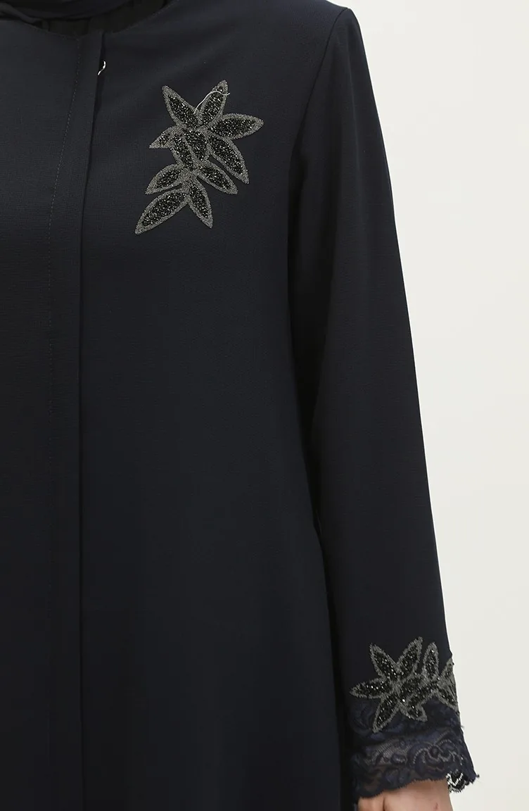 Abaya Détail Dentelle Brodée Grande Taille 5065-02 Bleu Marine 5065-02