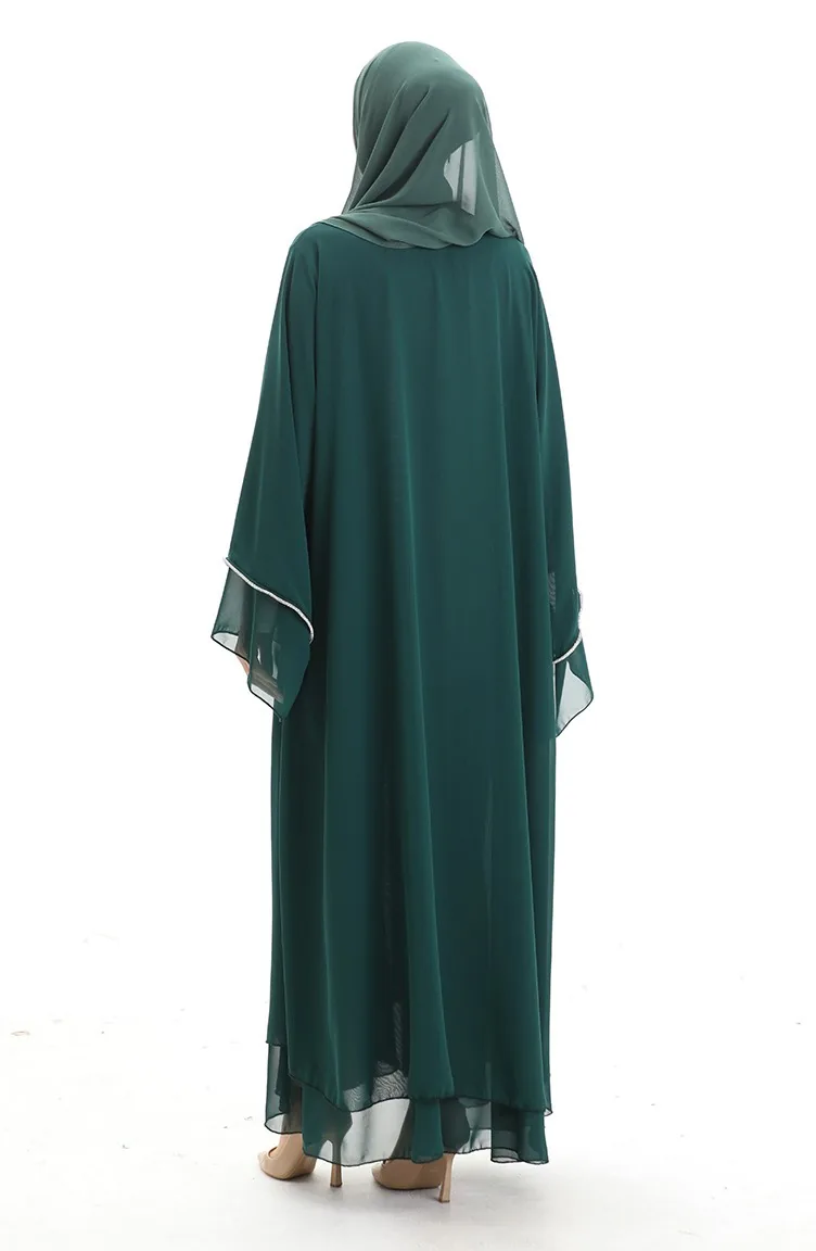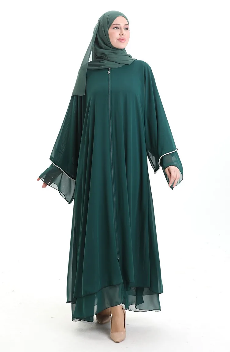 Abaya Zippée Avec Manches Ornées De Pierres 0167-03 Vert émeraude 0167-03