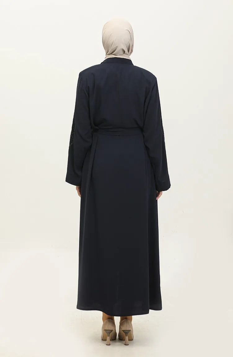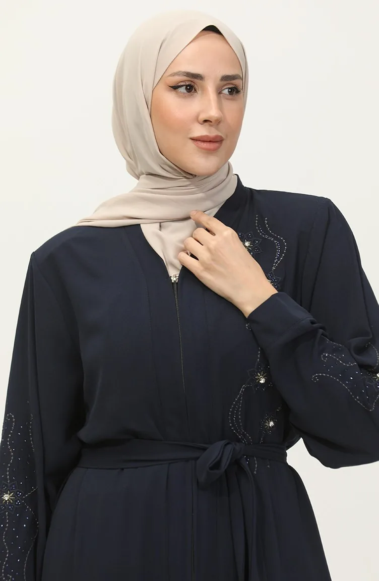 Abaya Zippée Brodée Stoned Bleu Marine 7847.Lacivert