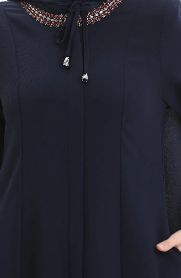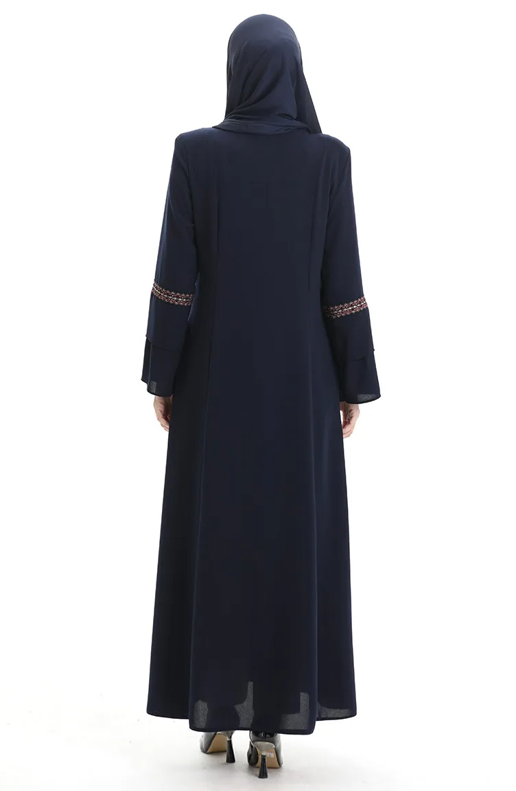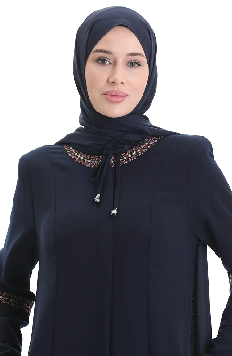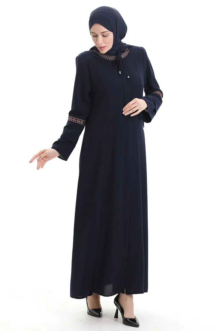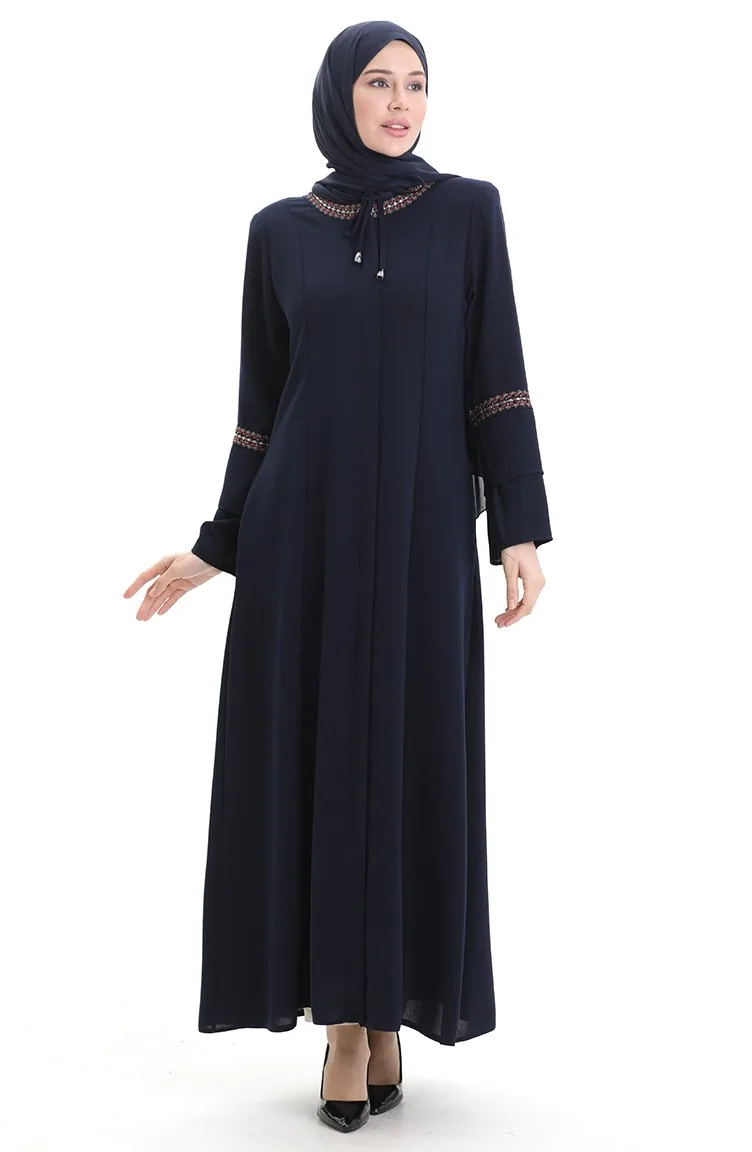 Abaya Brodée Grande Taille Avec Fermeture éclair Dissimulée 6193-04 Bleu Marine 6193-04