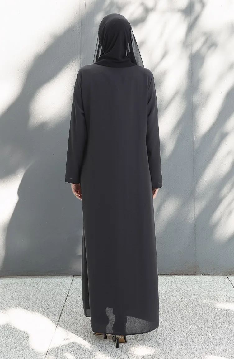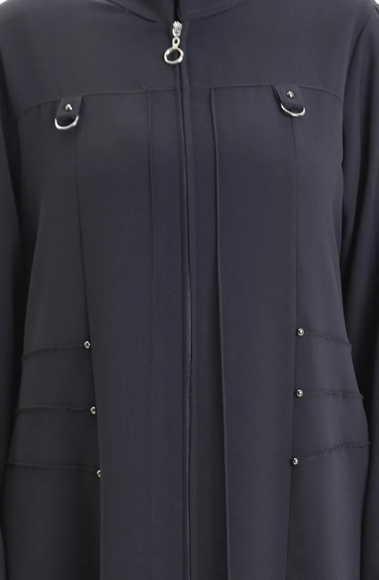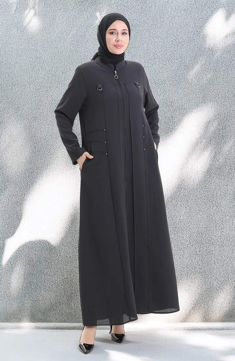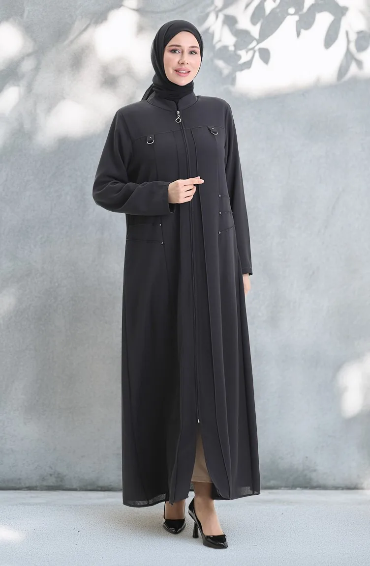 Abaya Zippée à Perles Métalliques Grande Taille 6148-06 Gris 6148-06