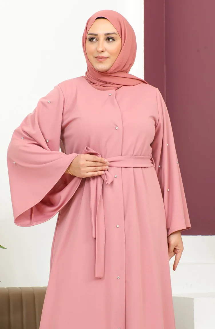 Abaya Avec Boutons Lapidés Grande Taille 8028-03 Rose Poudré 8028-03