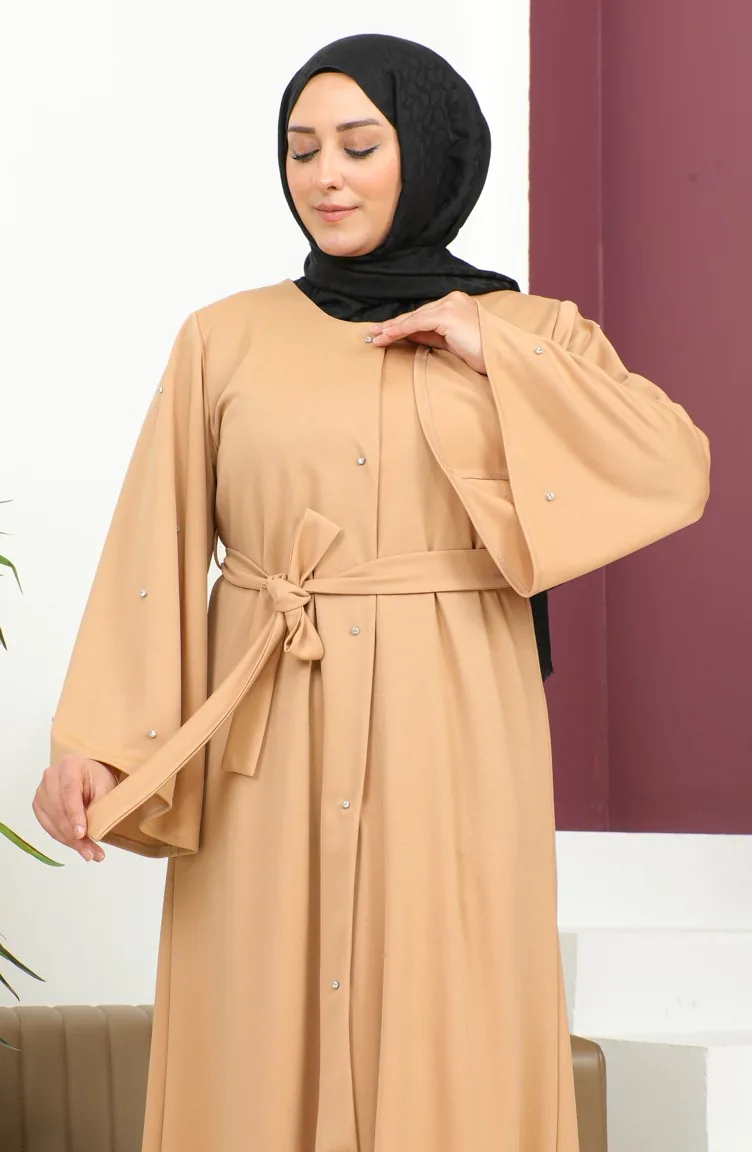 Abaya Avec Boutons Lapidés Grande Taille 8028-06 Brun Lait 8028-06
