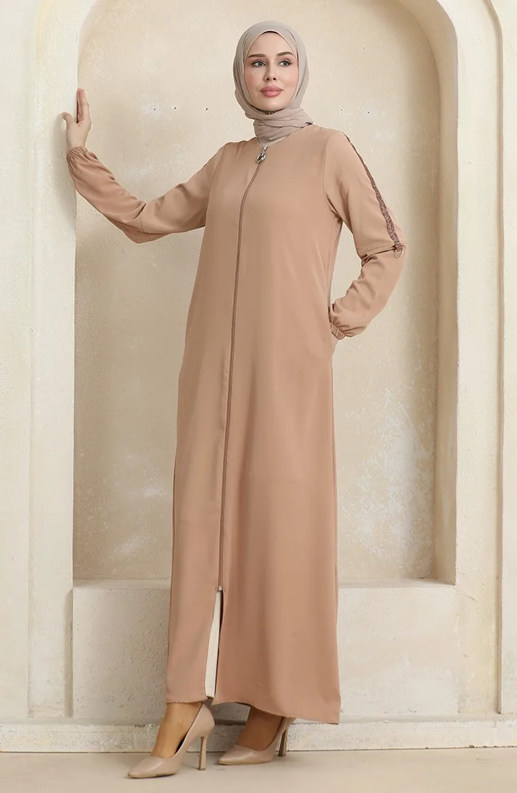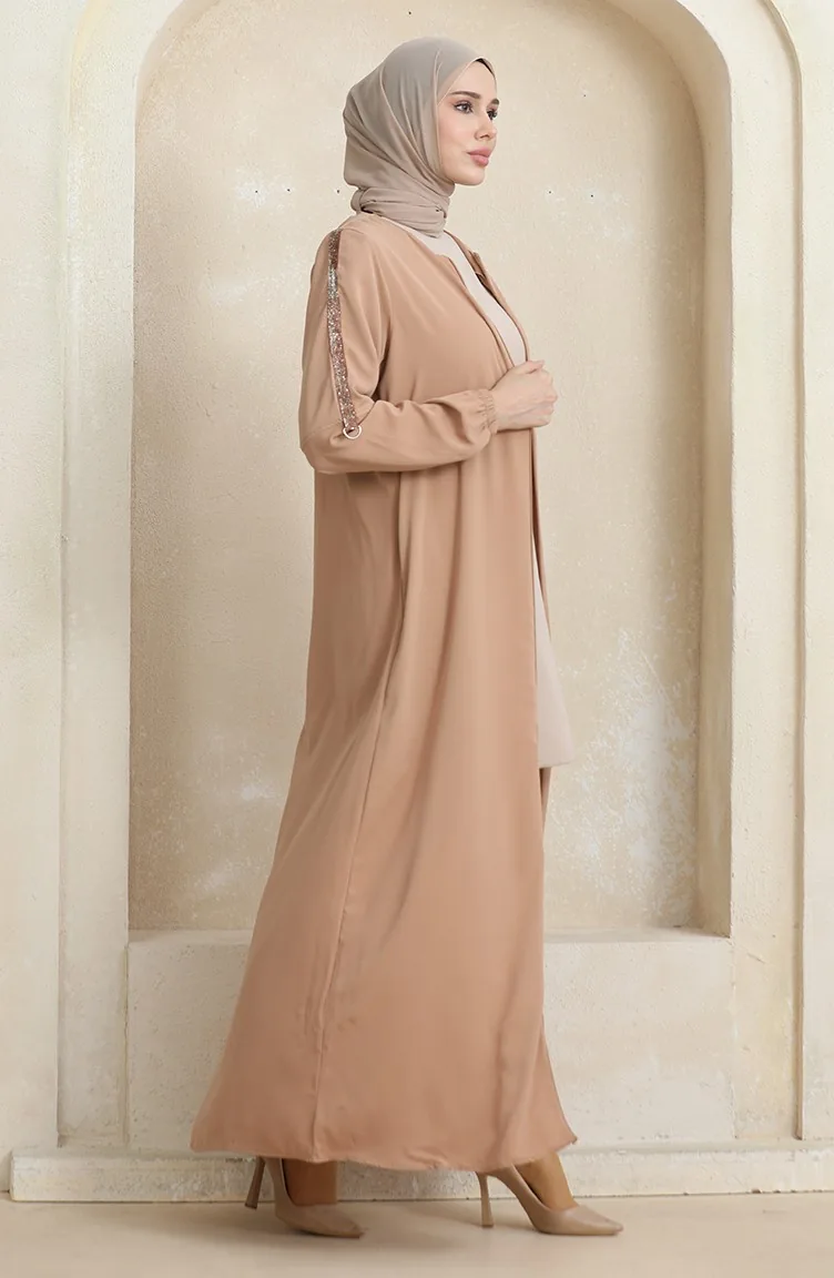 Abaya Motif Pierre Latéral 0464-02 Beige Foncé 0464-02