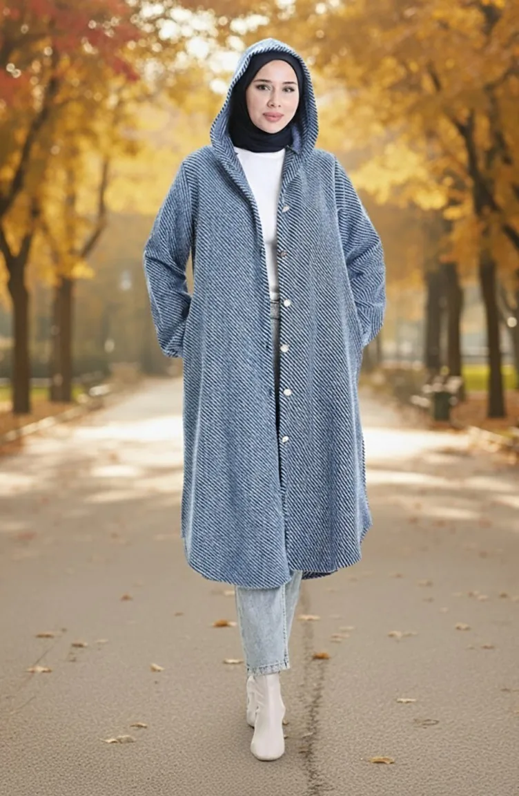 Manteau En Cachemire à Capuche Et Boutons 0201-02 Indigo 0201-02