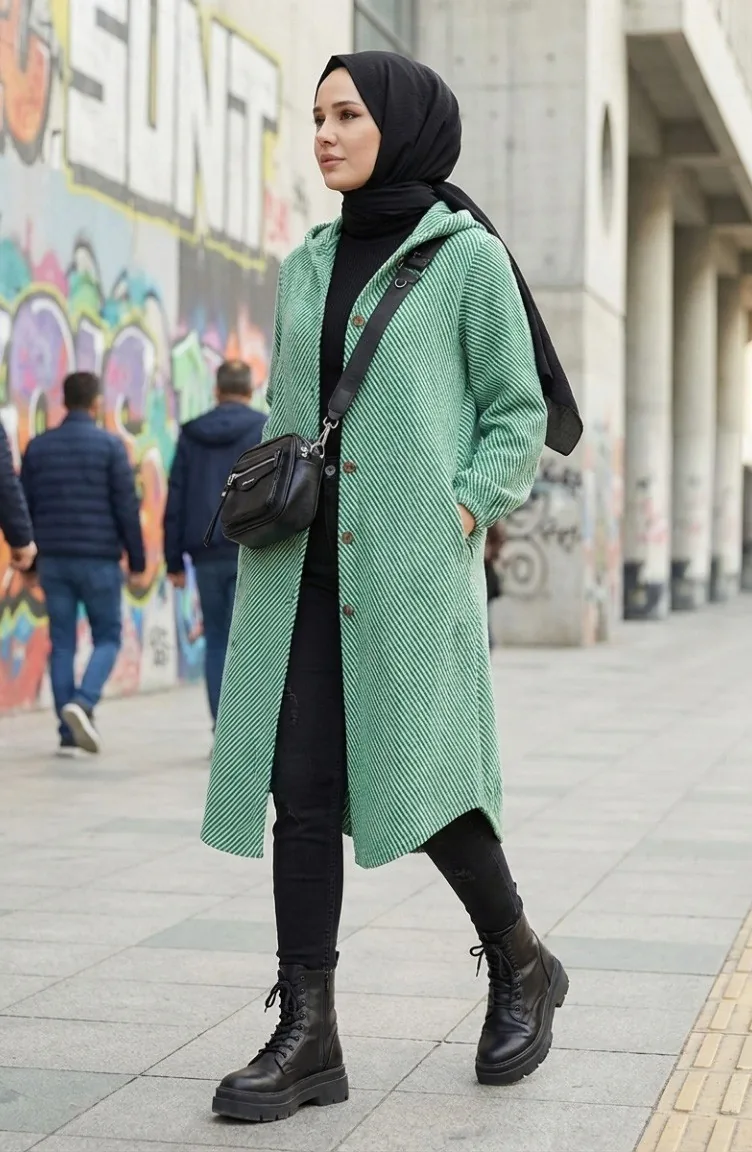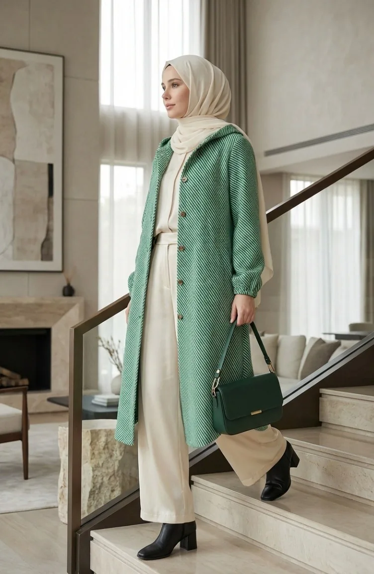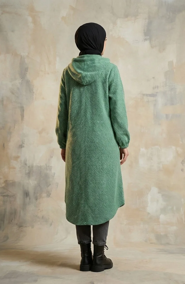 Couleur Verte. C'est un tissu molleton, vous pouvez l'utiliser facilement en hiver. A Rayures. Avec boutons. Manches élastiques. Hivernal. Option de grande taille disponible.