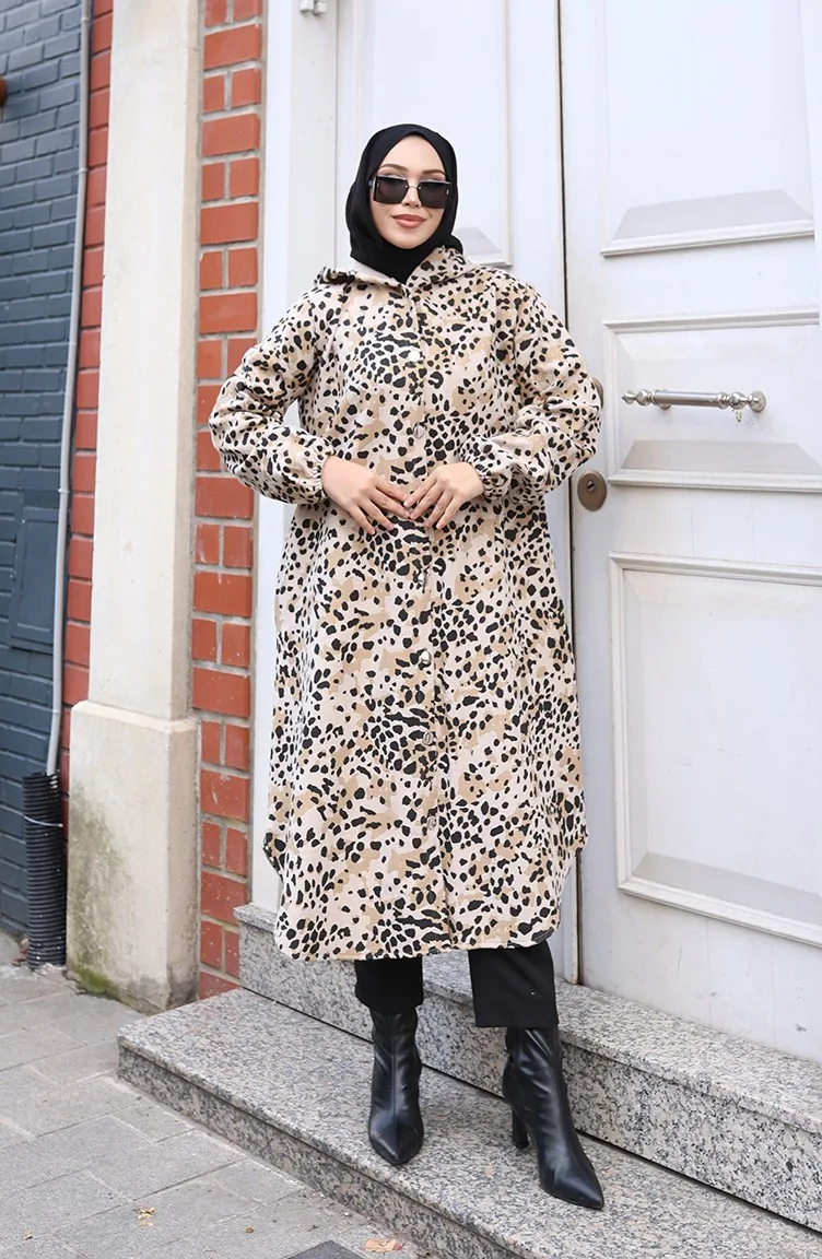 Couleur Beige. C'est un tissu molleton, vous pouvez l'utiliser facilement en hiver. Motif Léopard. Avec boutons. Manches élastiques. Hivernal. Option de grande taille disponible.