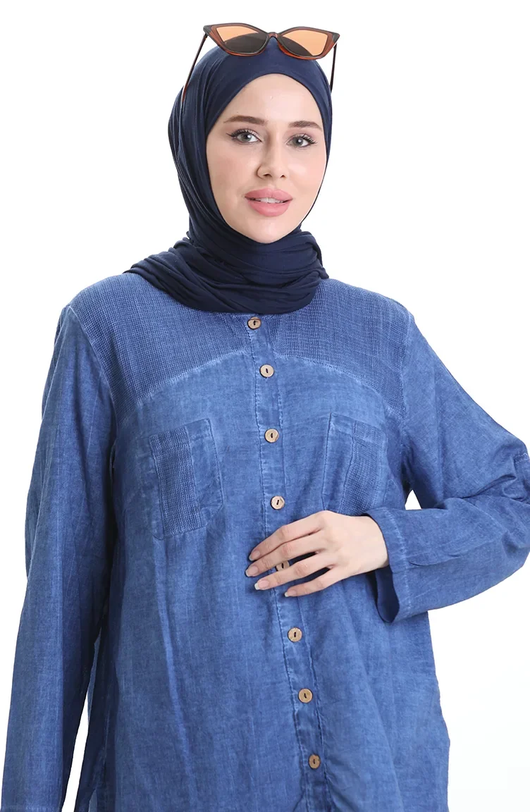 Couleur indigo. Şile Bezi. Simple. Détail poches. Col Zéro. d'été. Produit porté par le mannequin est sa propre taille.