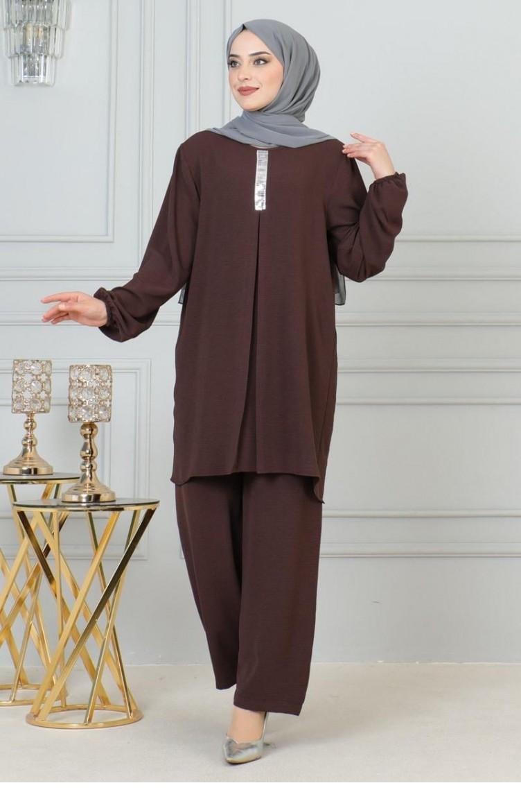 0070Mp Costume Hijab Détaillé À Paillettes Marron 17061