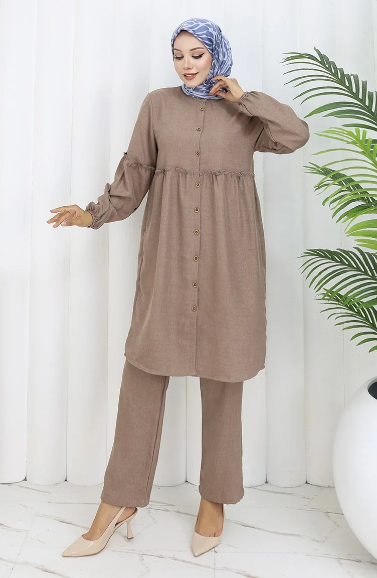 Ensemble Deux Pièces Tunique Et Pantalon Boutonnés Froncés 0115-04 Vison 0115-04