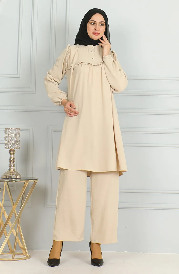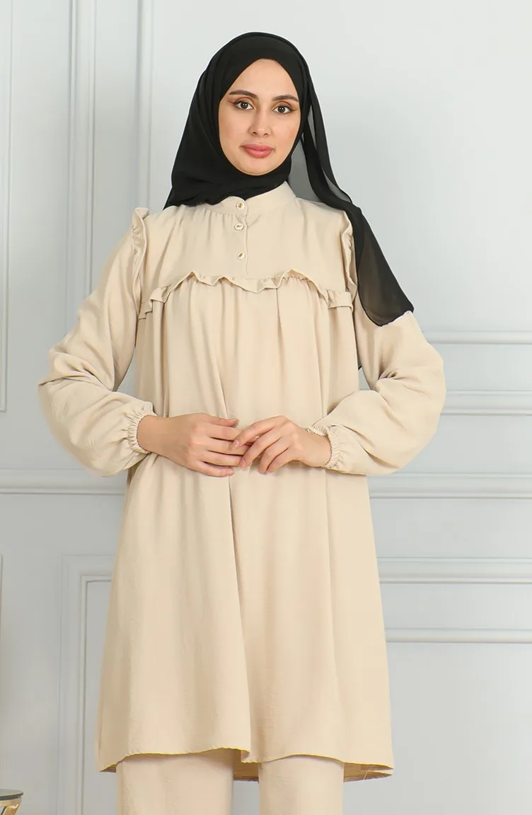 Ensemble Double Pantalon Tunique à Volants En Tissu Aerobin 1009-04 Beige 1009-04