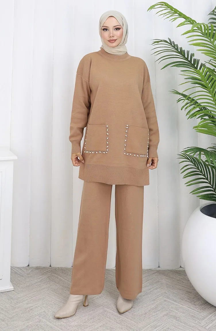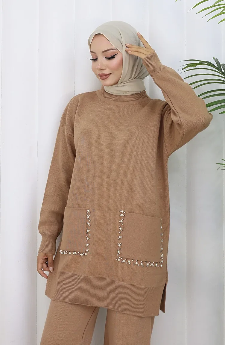 Ensemble Deux Pièces En Tricot Avec Poche Et Perles Tunique Et Pantalon Couleur Café Au Lait 1070-08 1070-08
