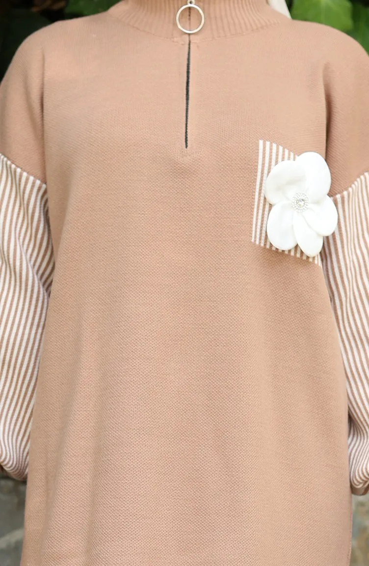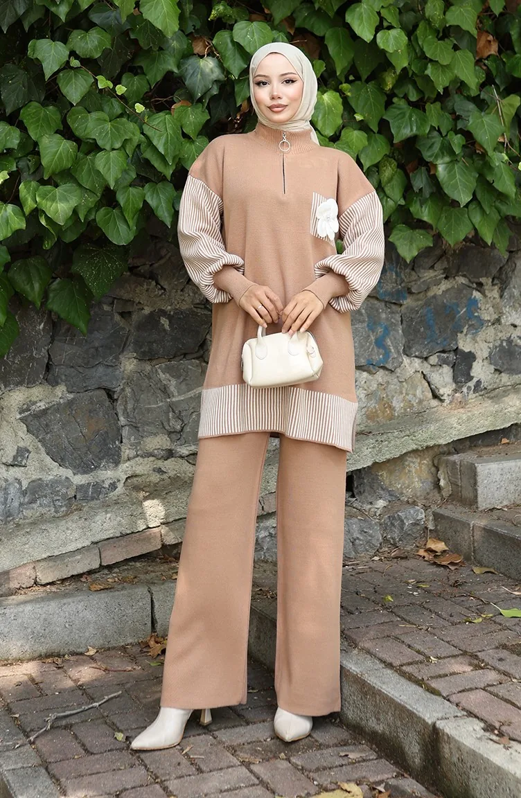 Ensemble Deux Pièces En Tricot Avec Tunique Et Pantalon à Fleurs Appliquées 1009-07 Café Au Lait 1009-07