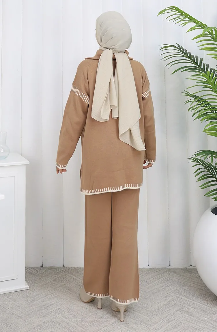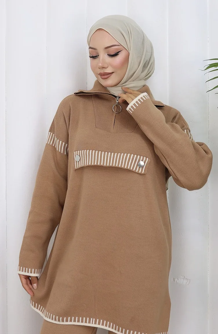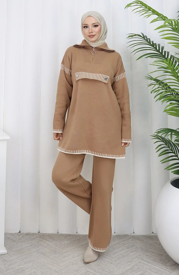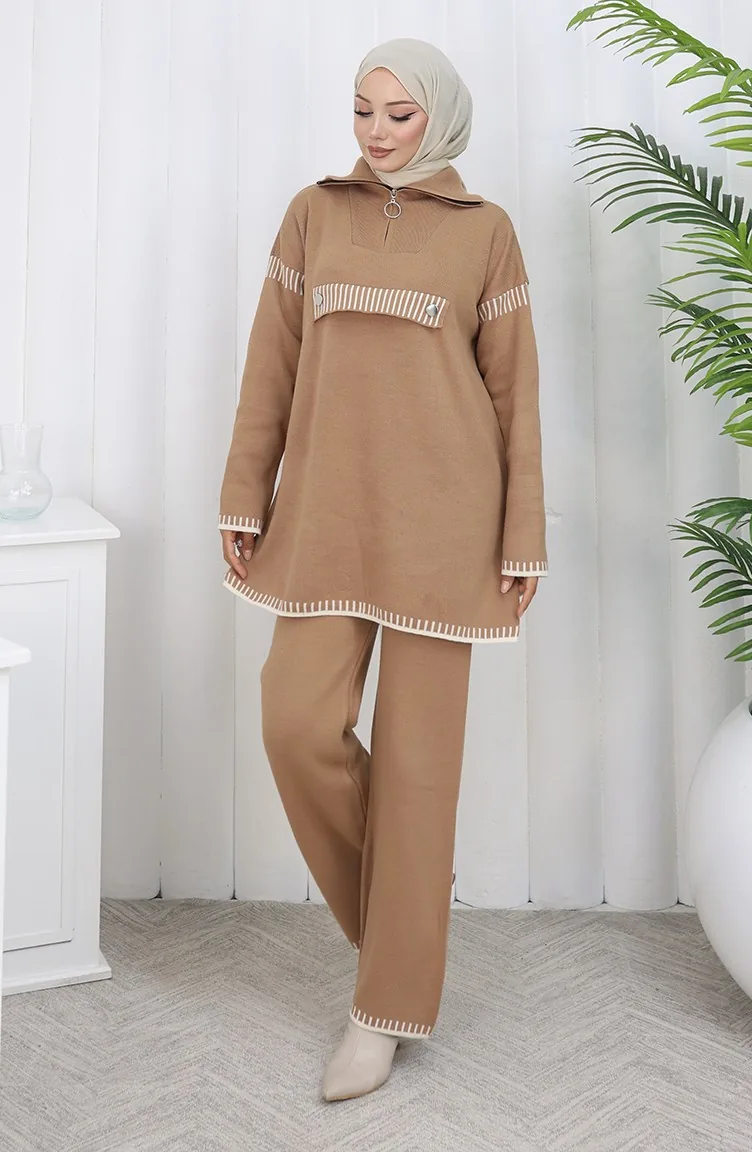 Ensemble Deux Pièces En Tricot Col Montant Tunique Zippée Et Pantalon Couleur Café Au Lait 1105-05 1105-05