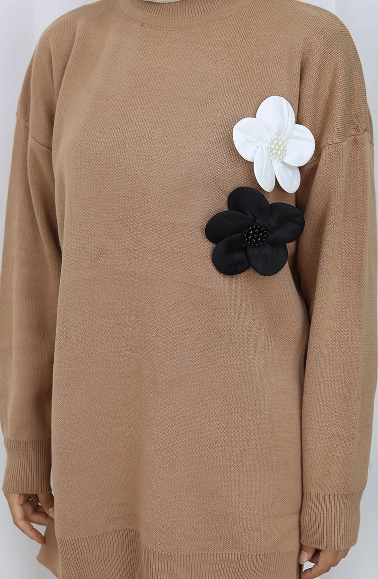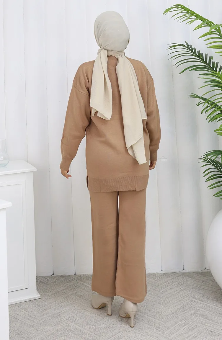 Ensemble Deux Pièces En Tricot Col Roulé Tunique Et Pantalon 1015-07 Café Au Lait 1015-07