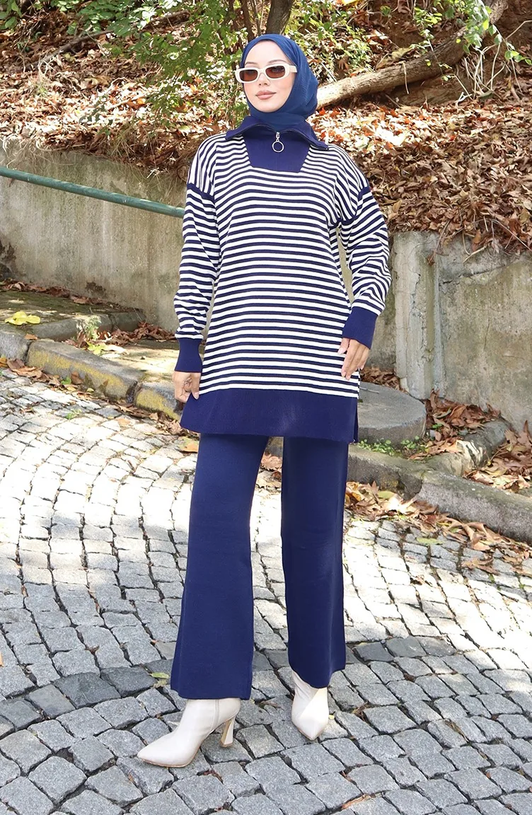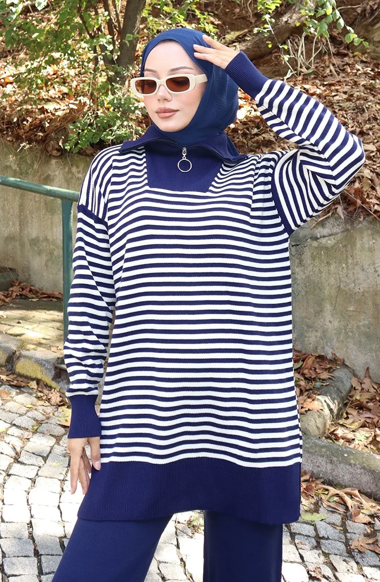 Ensemble Deux Pièces En Tricot Col Roulé Tunique Rayée Et Pantalon 1098-04 Bleu Marine 1098-04