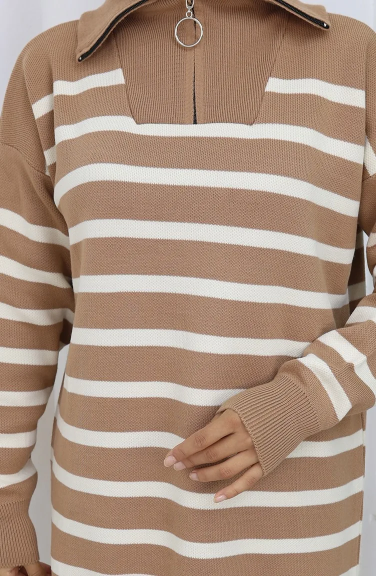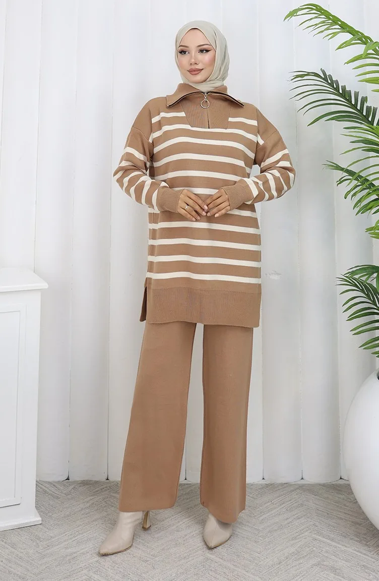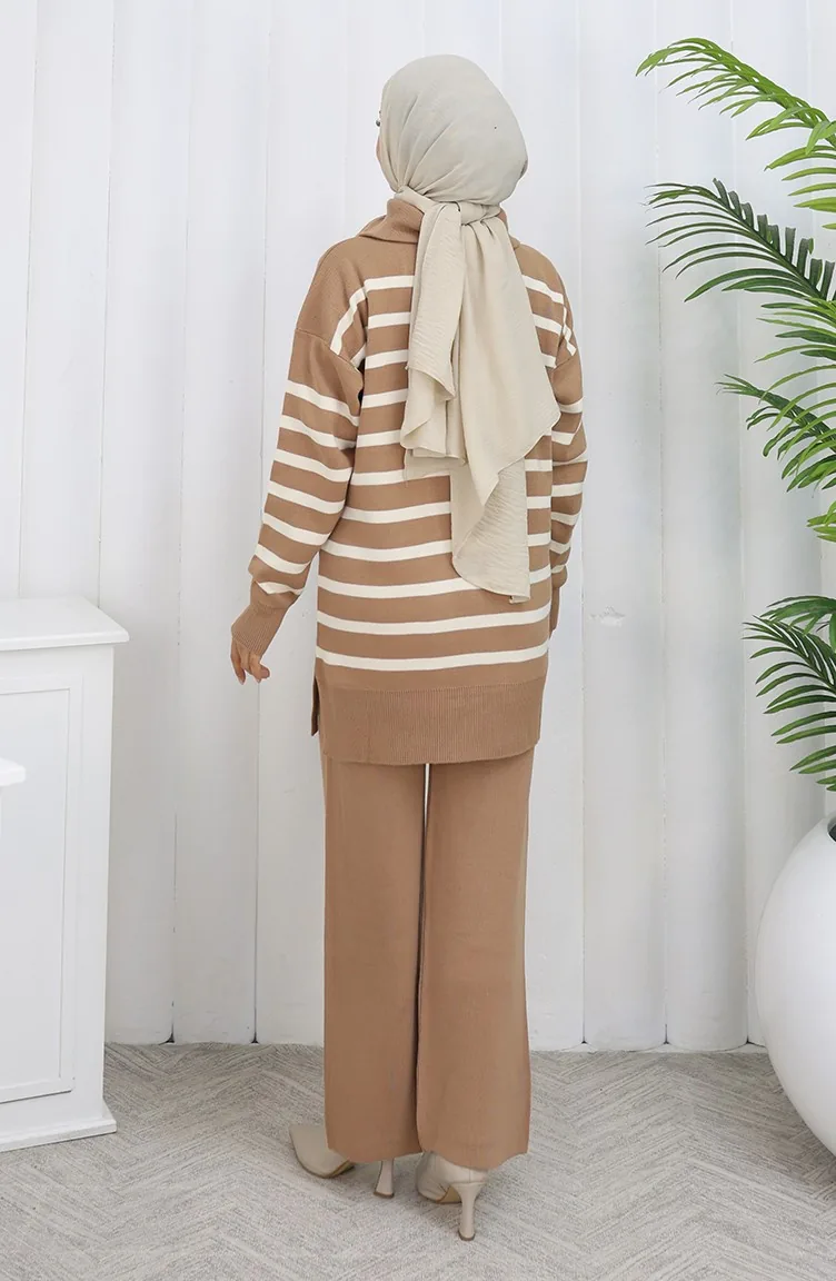 Ensemble Deux Pièces En Tricot Col Roulé Tunique Rayée Et Pantalon Couleur Café Au Lait 1107-05 1107-05